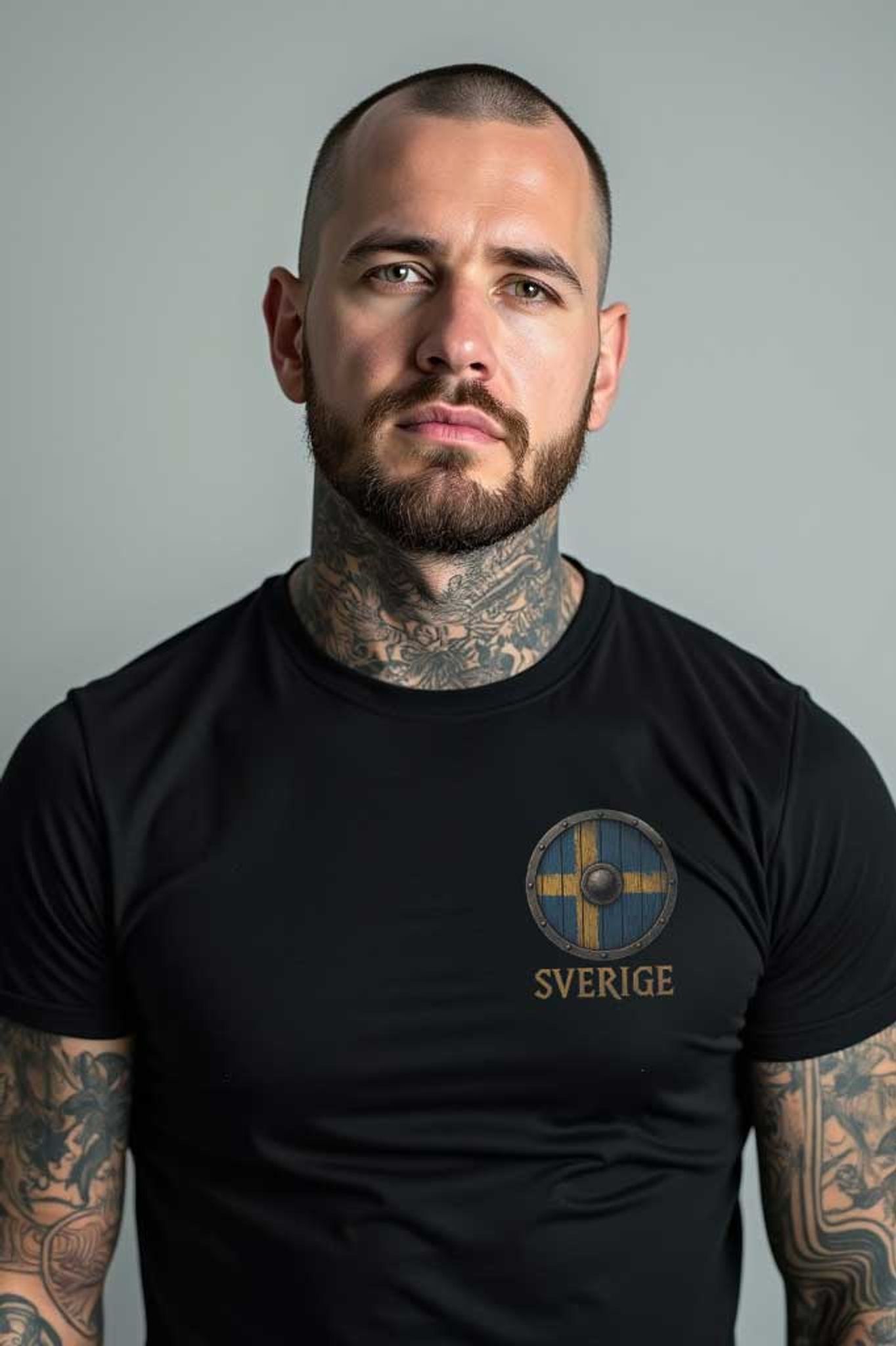 Den svarta basen gör att trycket står ut på ett snyggt och effektfullt sätt, samtidigt som tröjan är lätt att matcha med både vardagskläder och mer sportiga outfits. Oavsett om du använder den på fritiden, under resor eller vid evenemang blir Sverige sköld T-shirt ett tidlöst plagg som aldrig går ur stil.