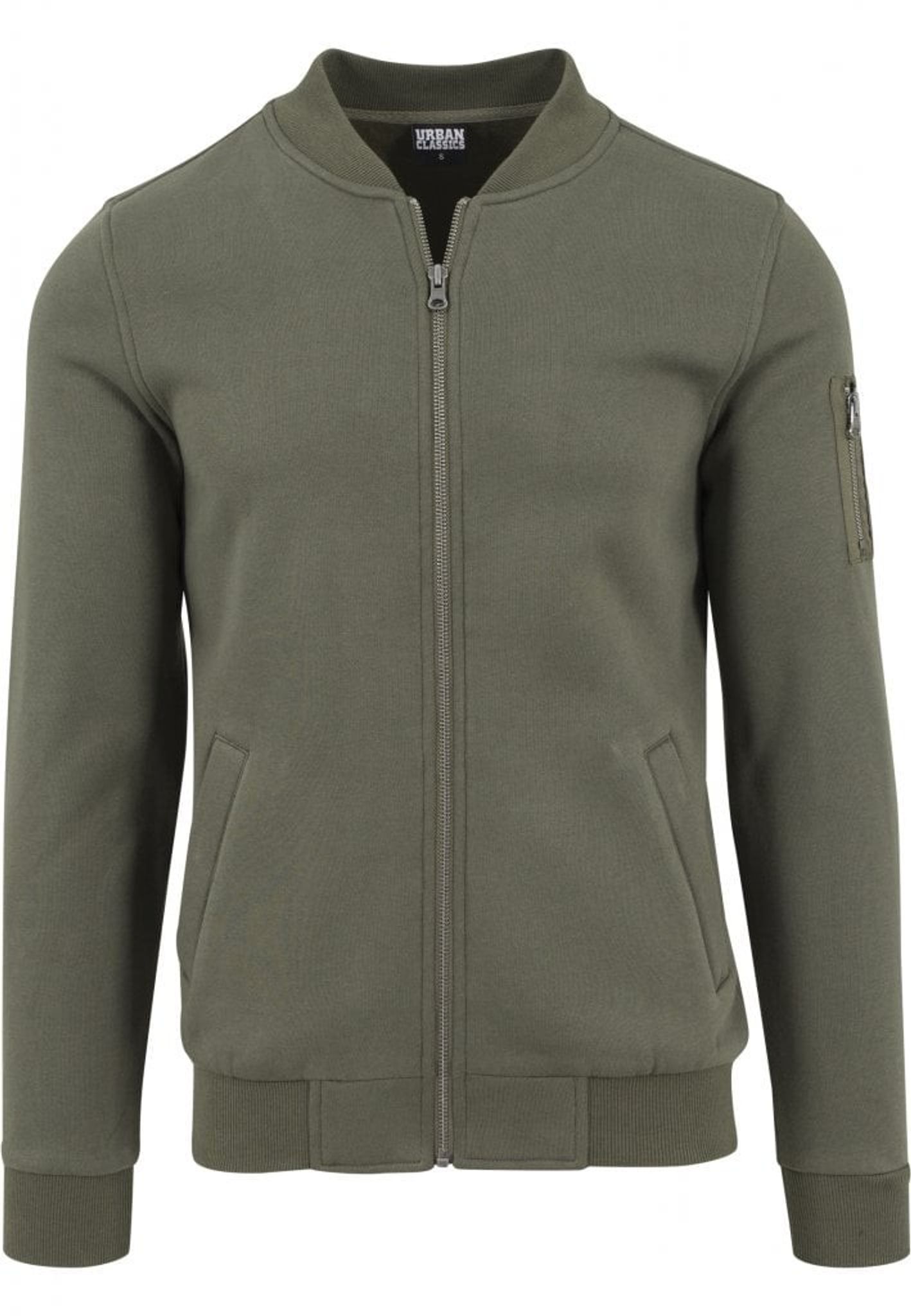 The jacket is closed with a zipper and the collar is the same as a bomber jacket.