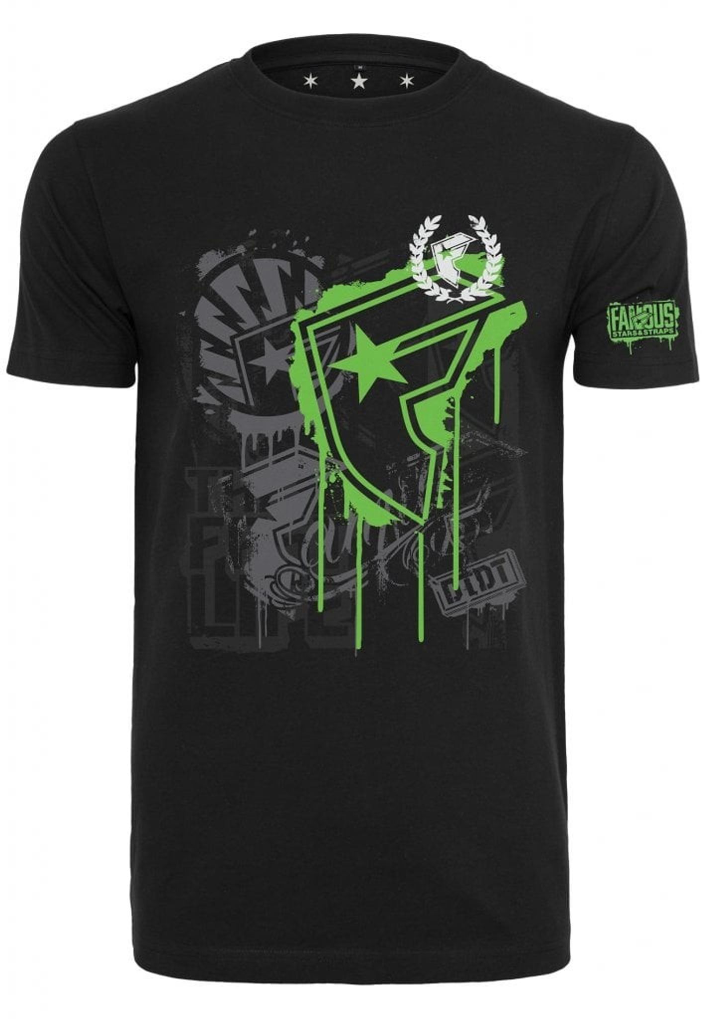 T-shirt with Famous print on the front and on sleeves. 100% cotton. The t-shirt is black with Riot Wall print in white, gray and green color combination.