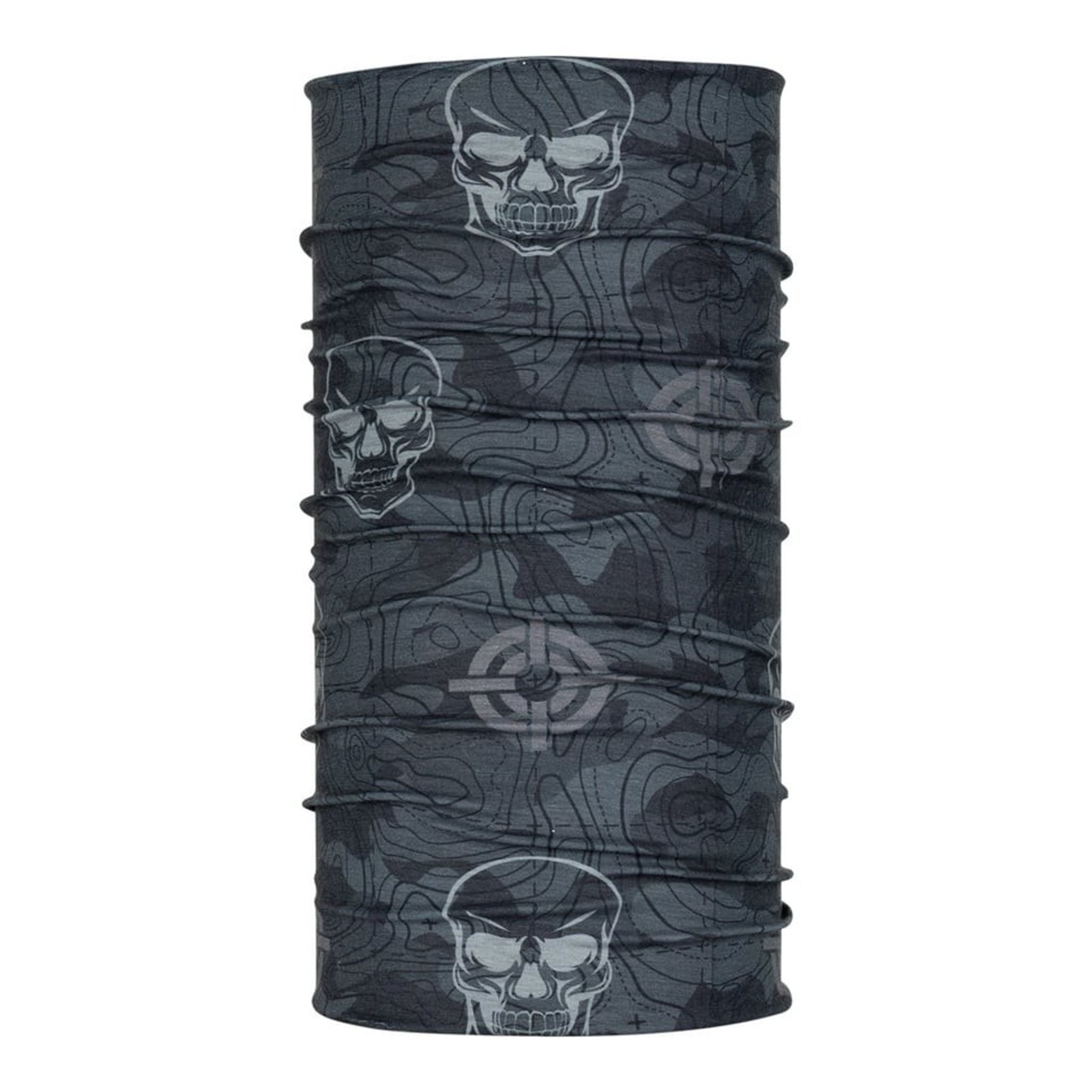 This tube scarf features a beautifully detailed design with night camouflage color and stylish graphic elements such as a target board and a skull. It also has a topographic elevation map for an extra touch of wilderness feel.