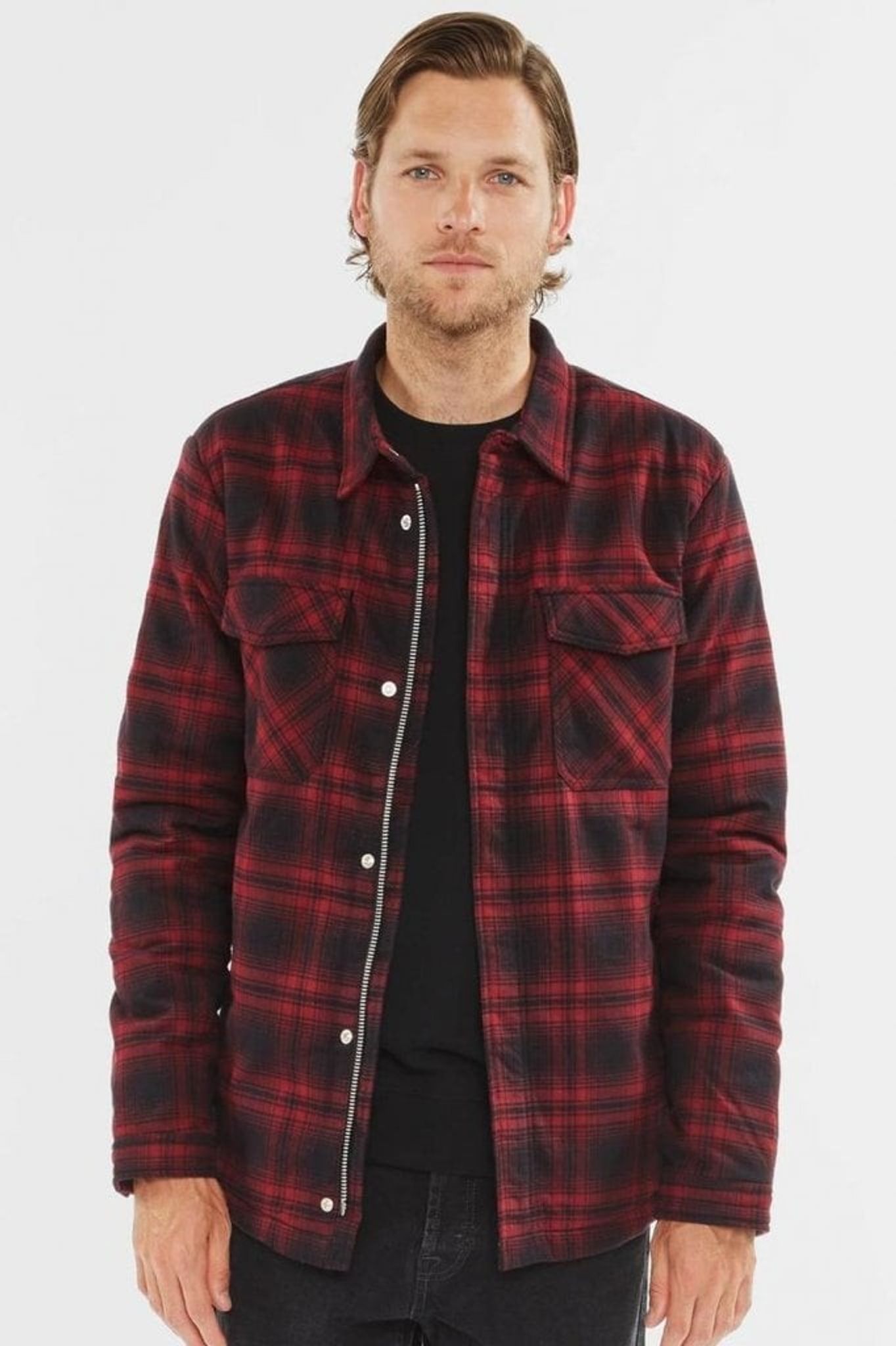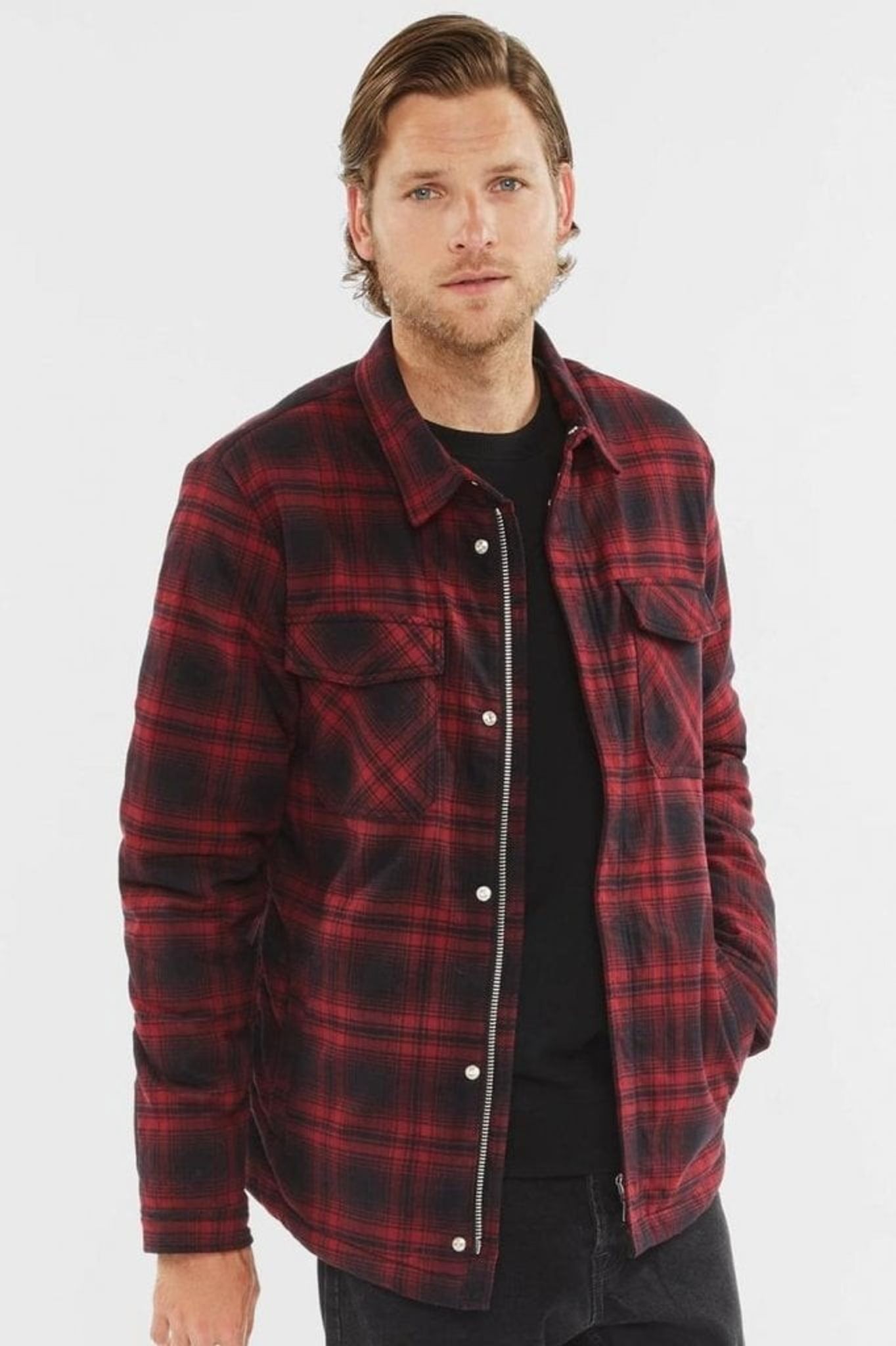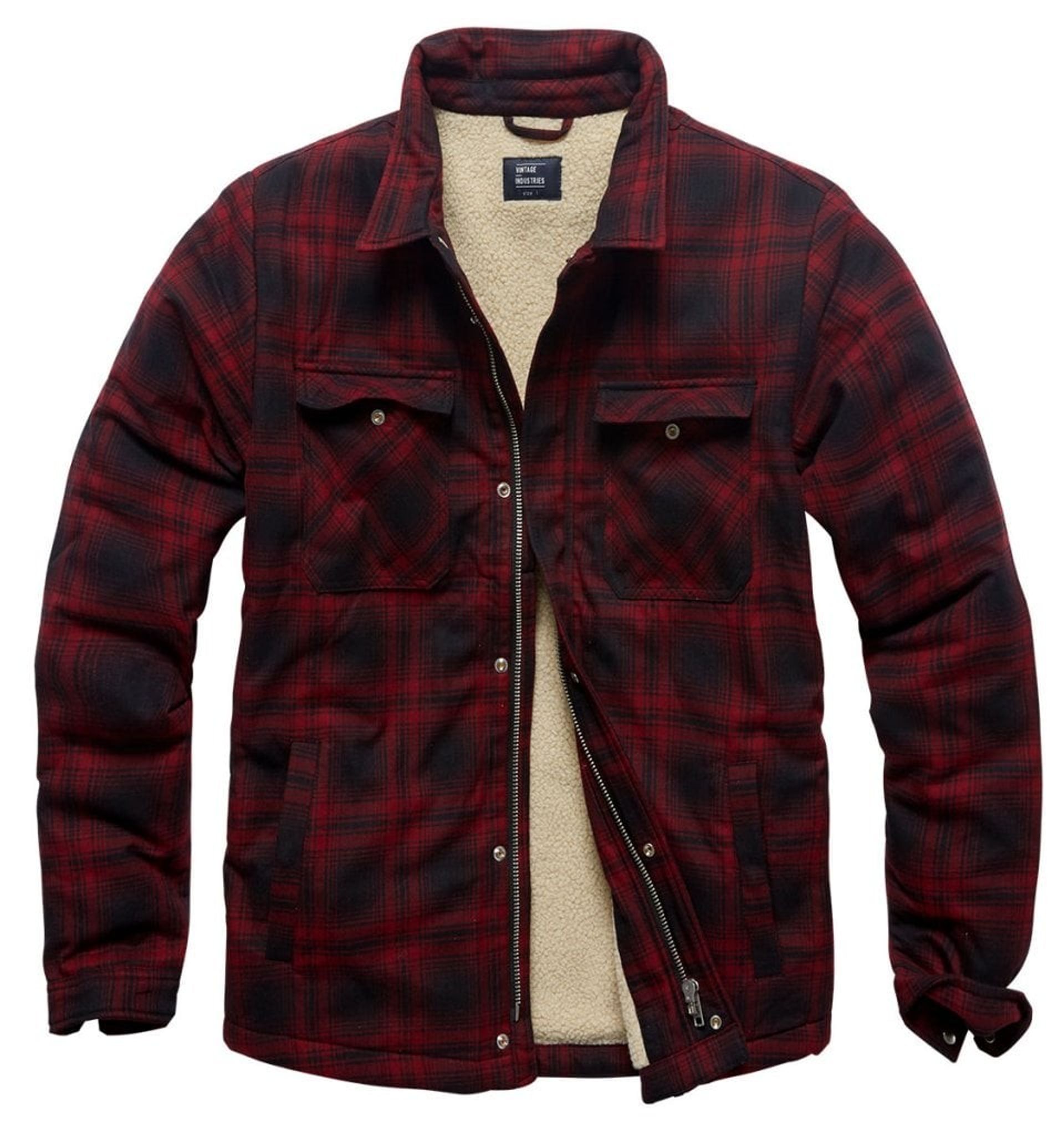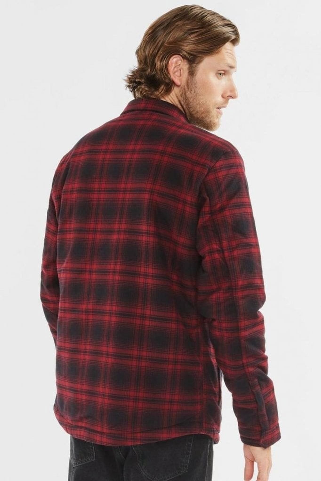 A modern lumber jacket with fabric in red and black. The inside is dressed in a beige teddy lining. On both sides there are large chest pockets and two side pockets.