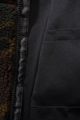 A teddy fleece jacket and a discreet woodland camo. The jacket is opened and closed with a zipper that can be pulled all the way up over the chin. The jacket is equipped with elastic bands at both the cuffs and waist, which prevents wind from finding its way under the jacket.