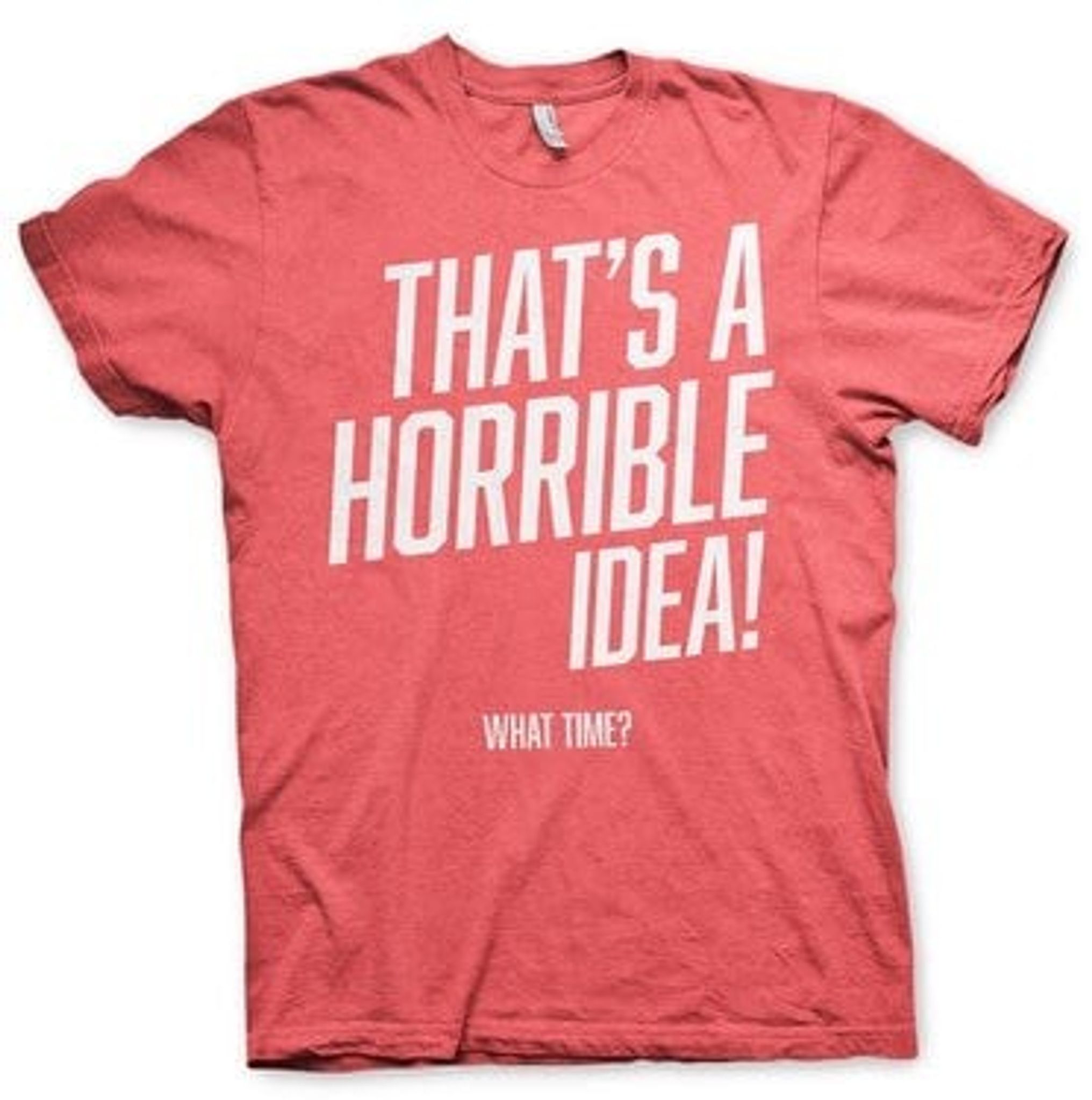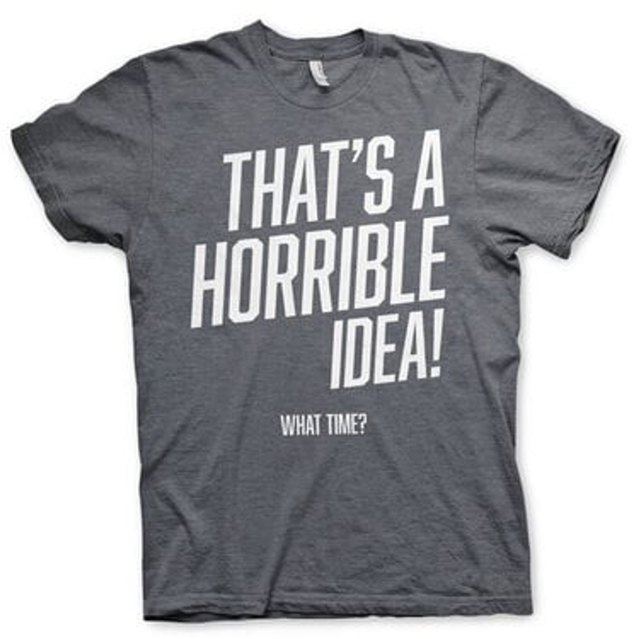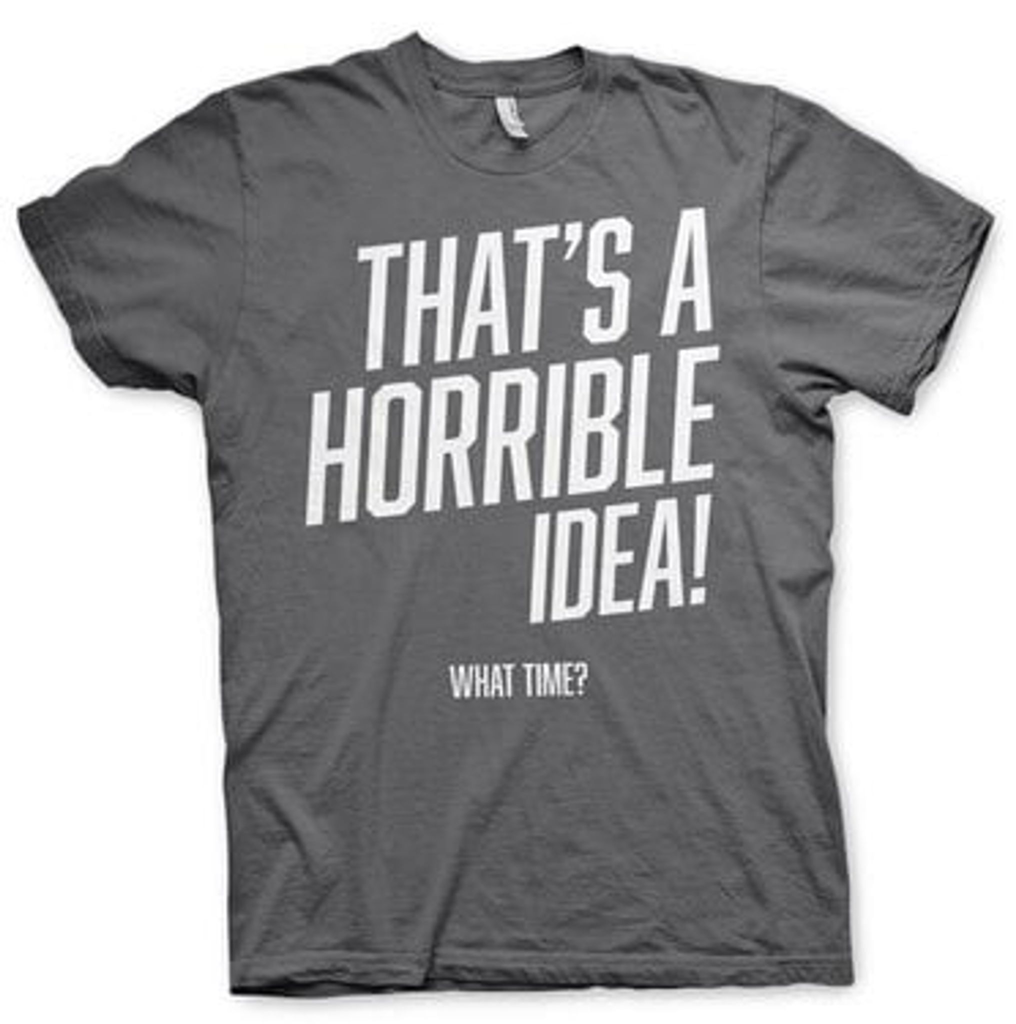 Have you ever come up with a crazy idea and instead of being advised, you have been met with the question "What time?" Then this t-shirt is for you! With a humorous twist and a recognizable sensation is that's a horrible idea, what time? T-shirt The perfect sweater for anyone who loves to push the boundaries and find crazy ideas.