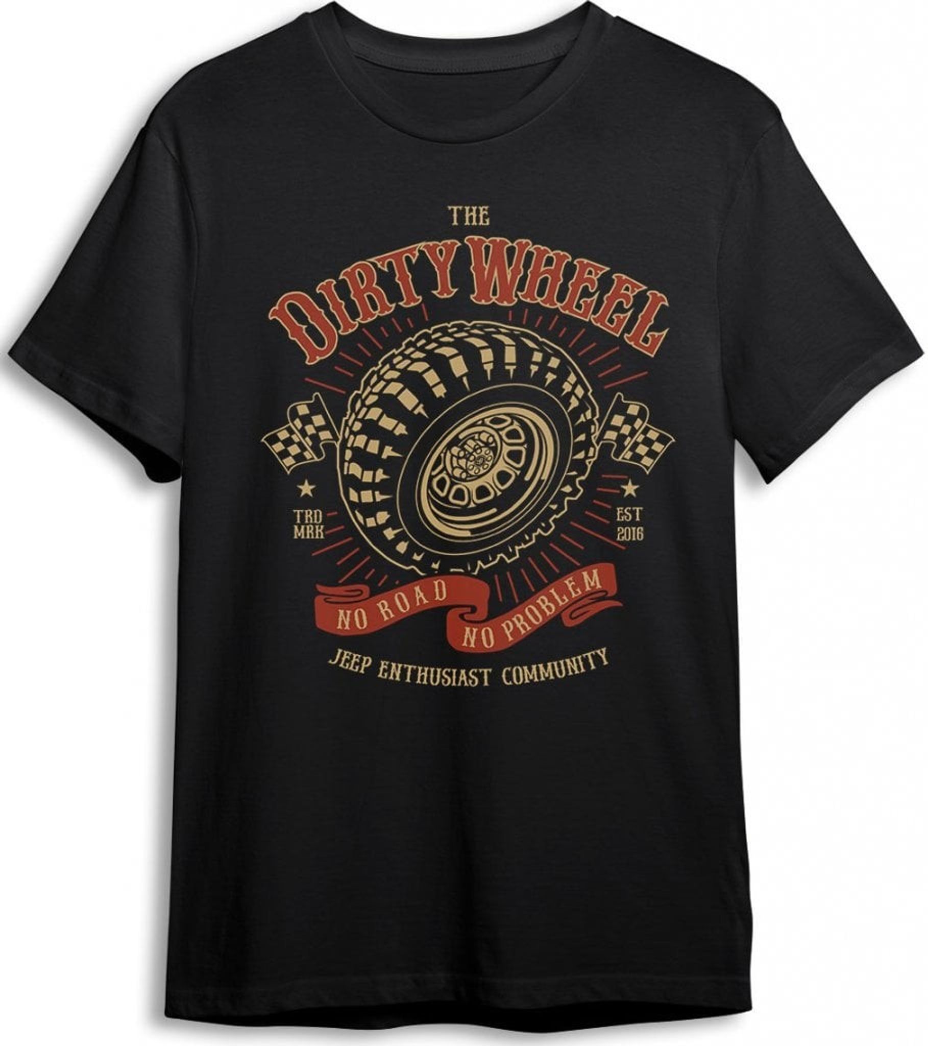 T-shirt with the print "Dirty Wheel" which is a tribute to the Jeep as an off-road vehicle and is an excellent product for all Jeep lovers and off-road enthusiasts.
