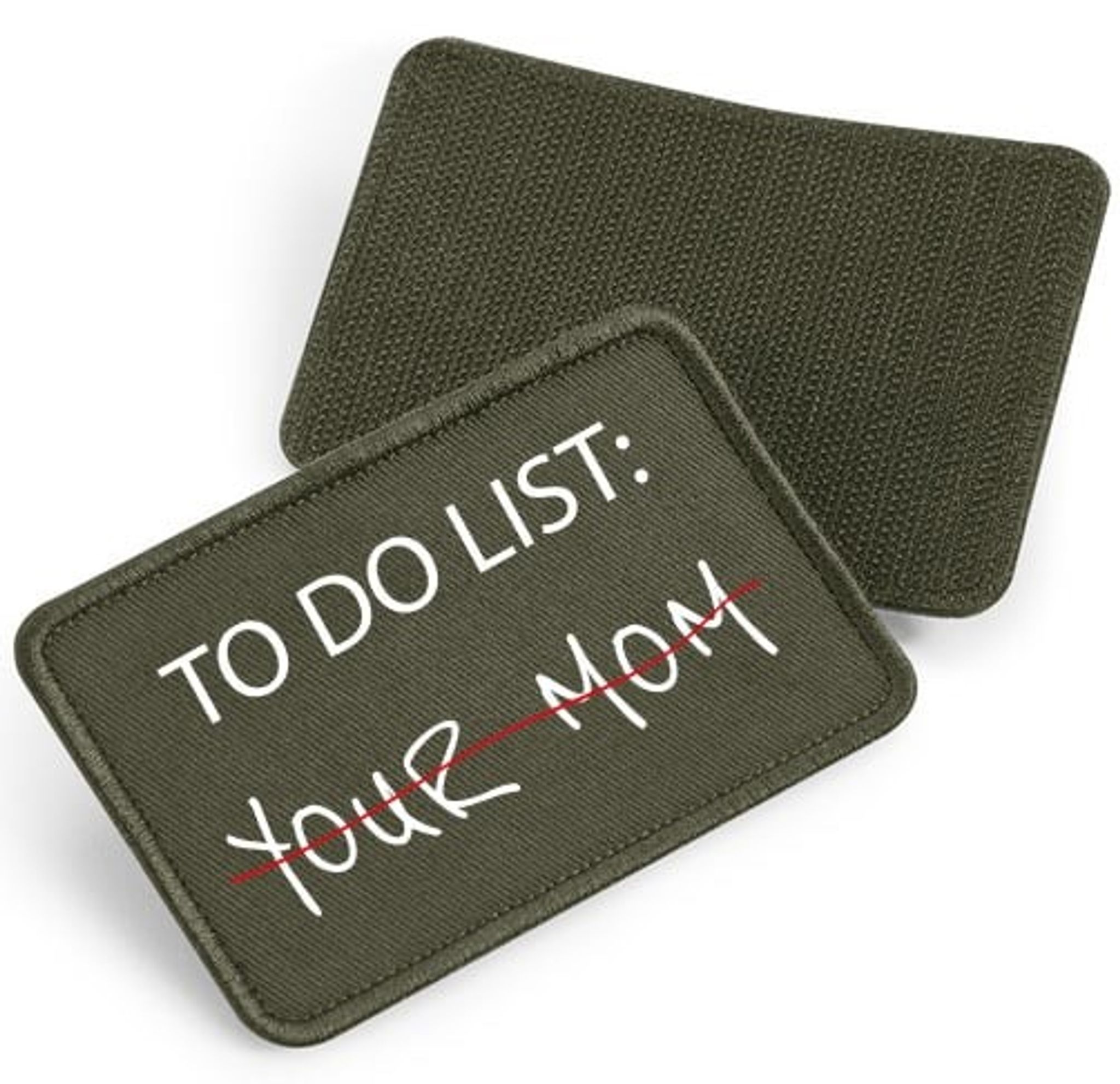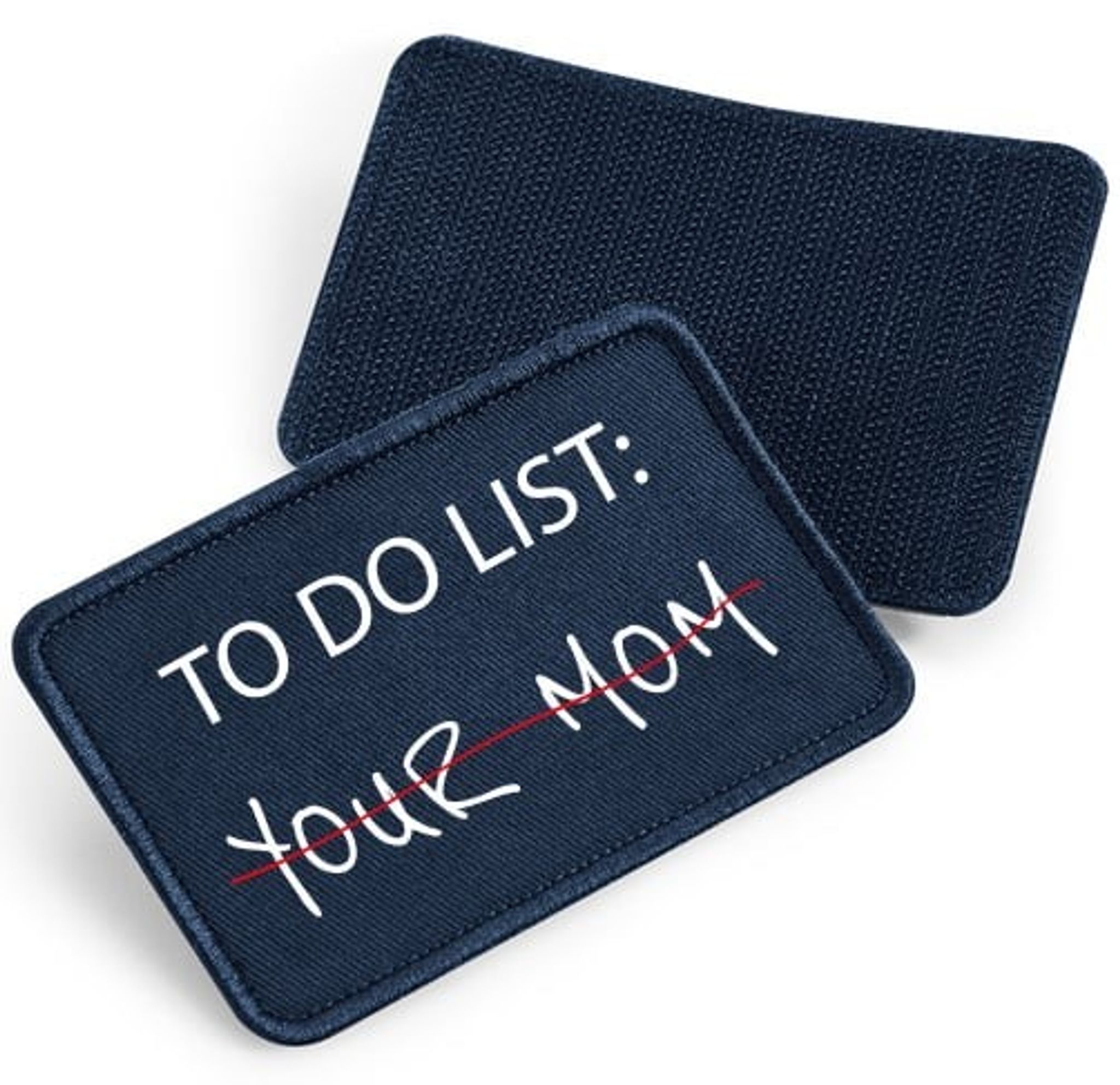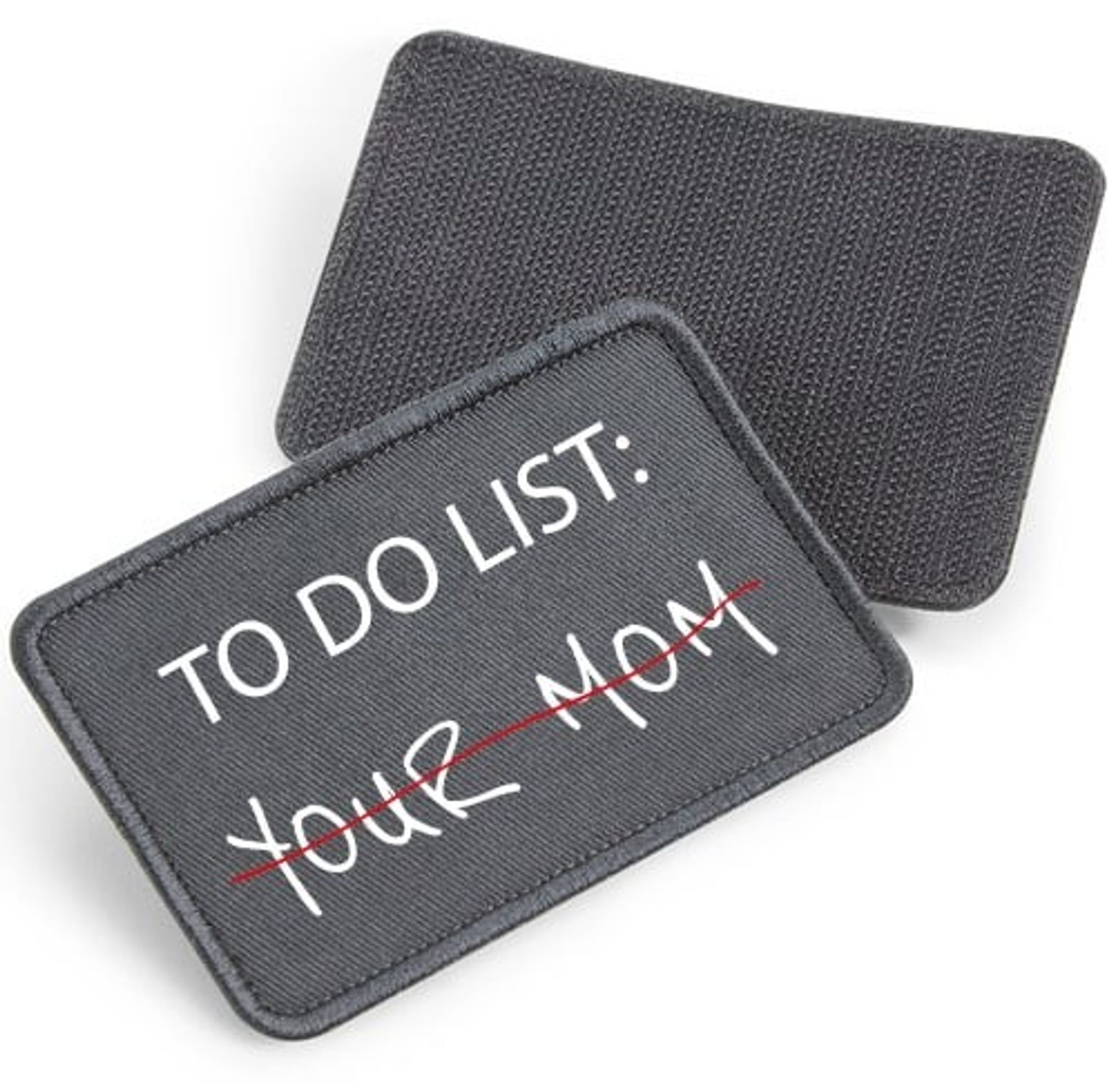 This humorous fabric patch is perfect for anyone who appreciates a good sense of humor and isn't afraid to show it. Featuring the text "TO DO LIST: Your Mom", this patch is a playful nod to classic jokes and is sure to draw a few laughs and raised eyebrows. It is 10 x 6.5 cm in size, which makes it eye-catching enough to attach to your backpack, jacket or why not as a unique detail on your computer bag.