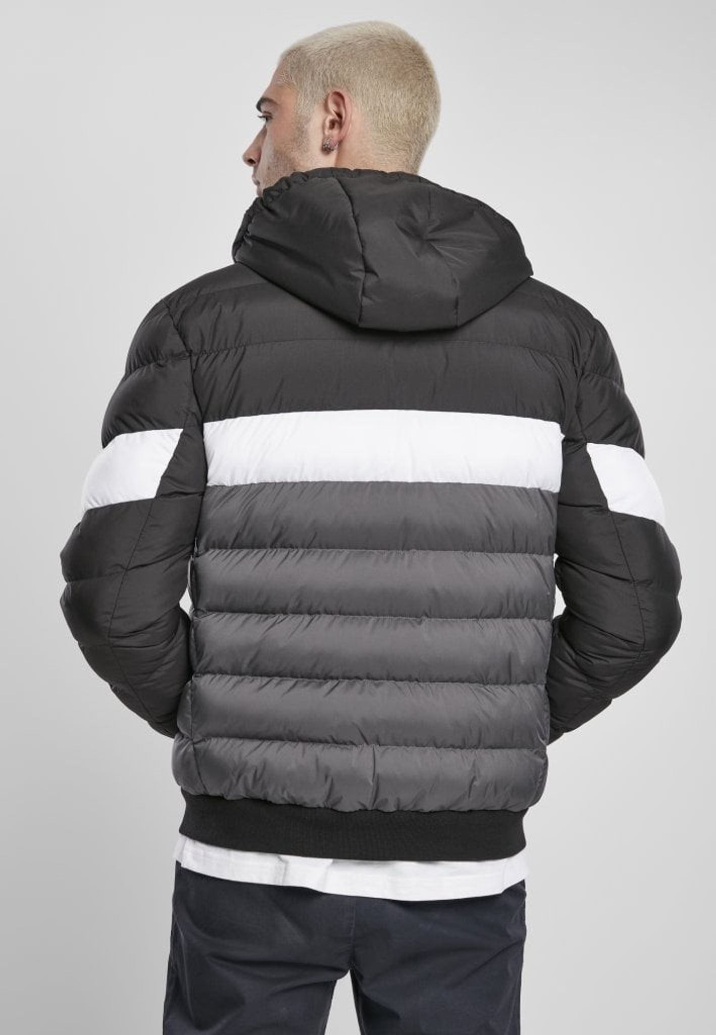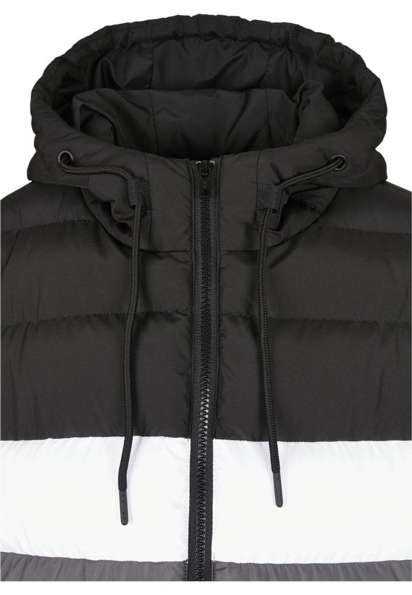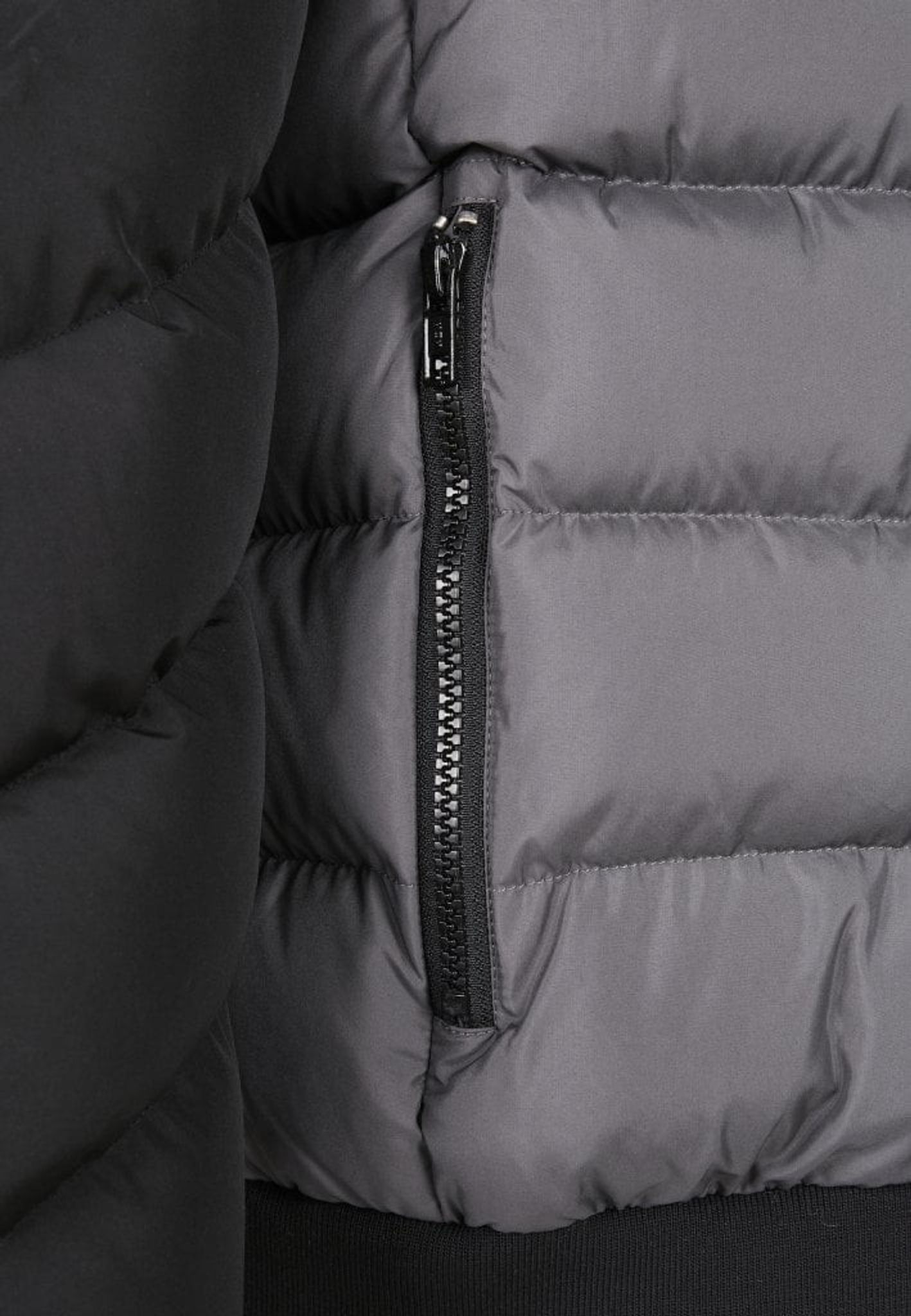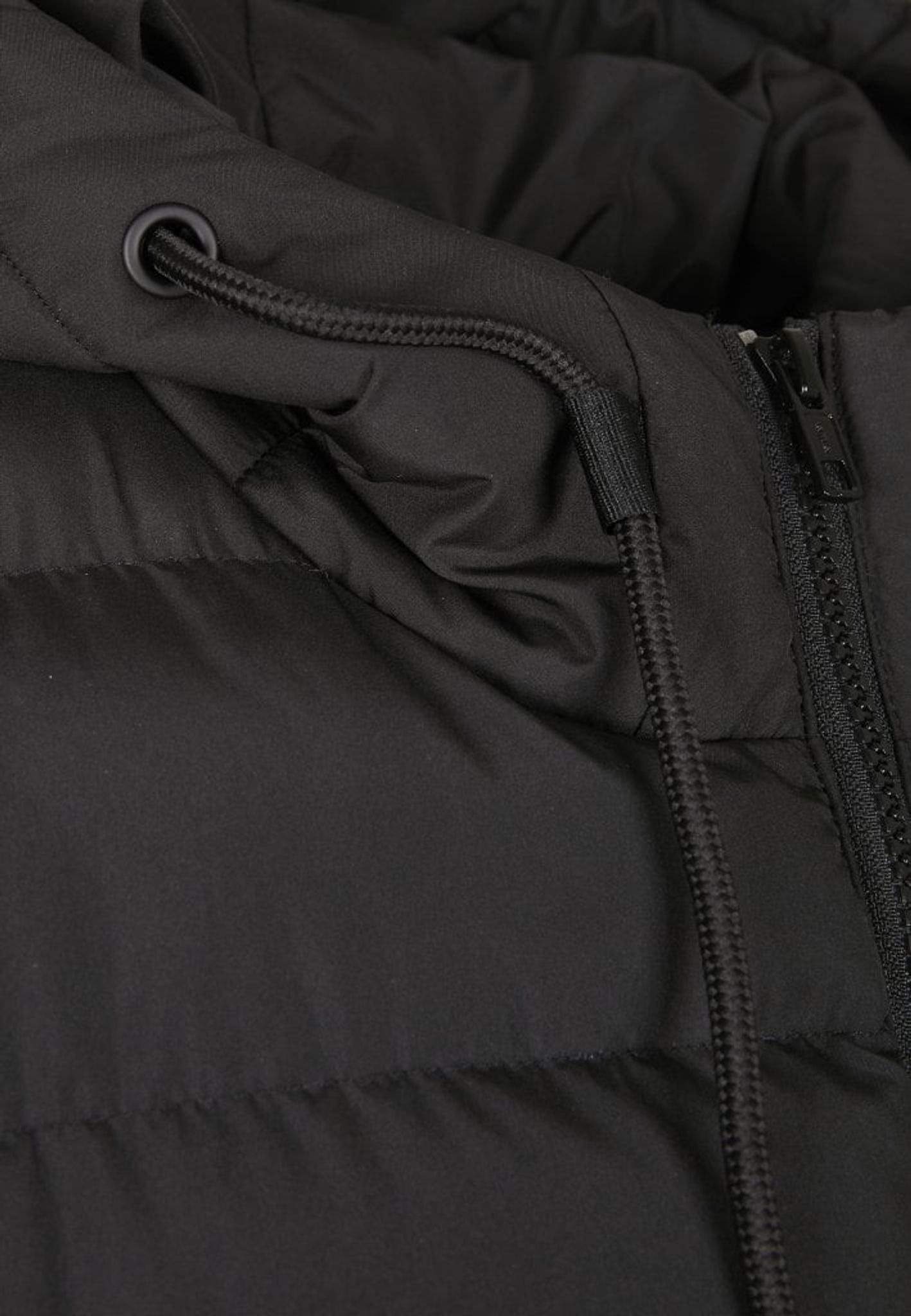 The hooded jacket is closed with a zipper at the front and it goes high up in the neck.