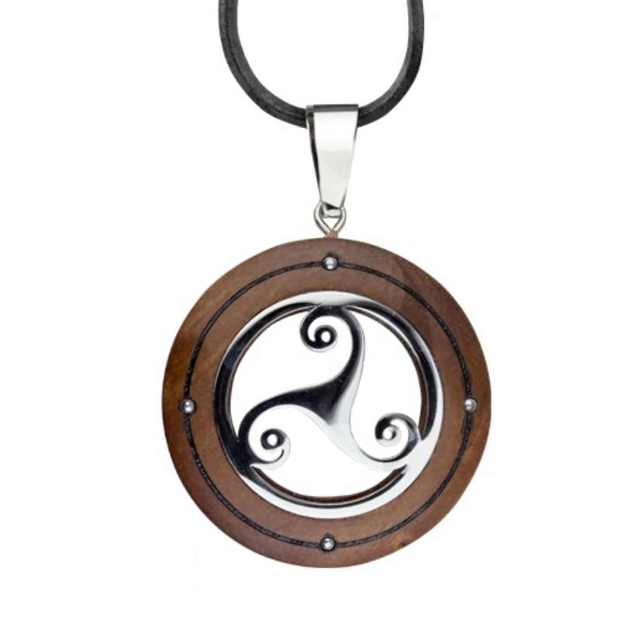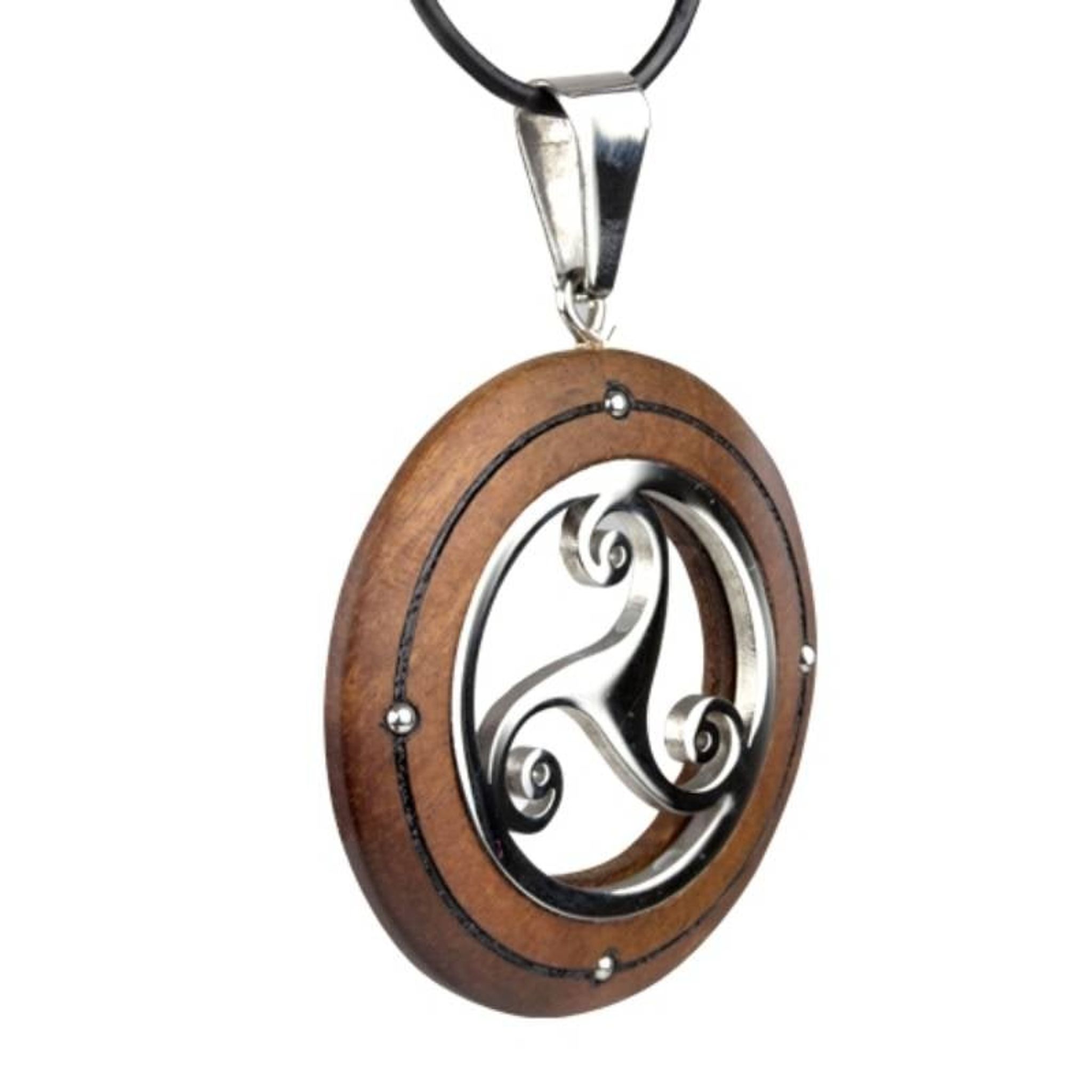 Triskel wooden pendant necklace.