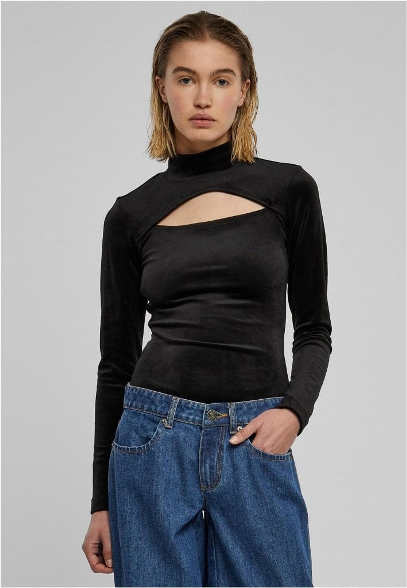 - Bold turtleneck design with cutout detail.