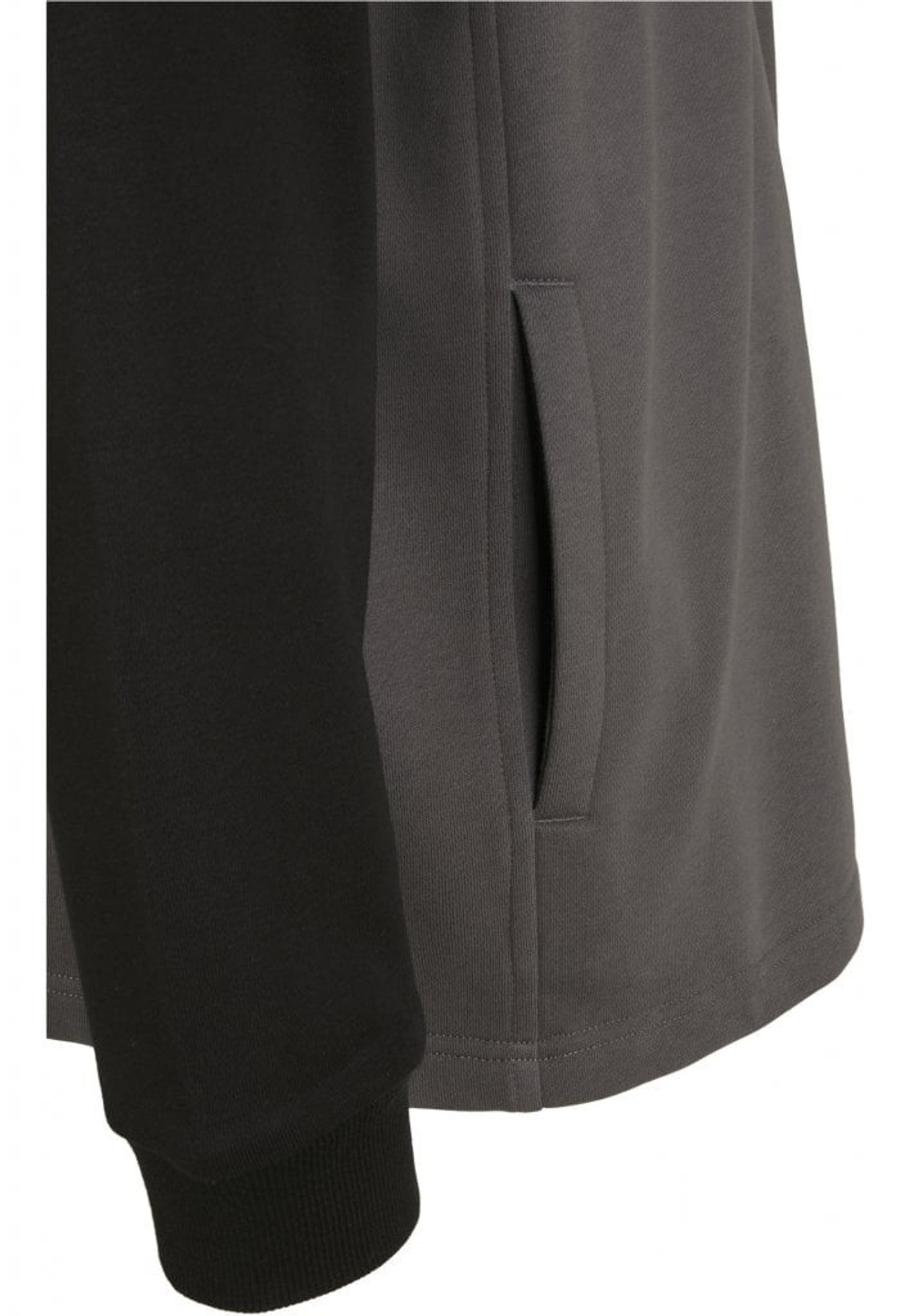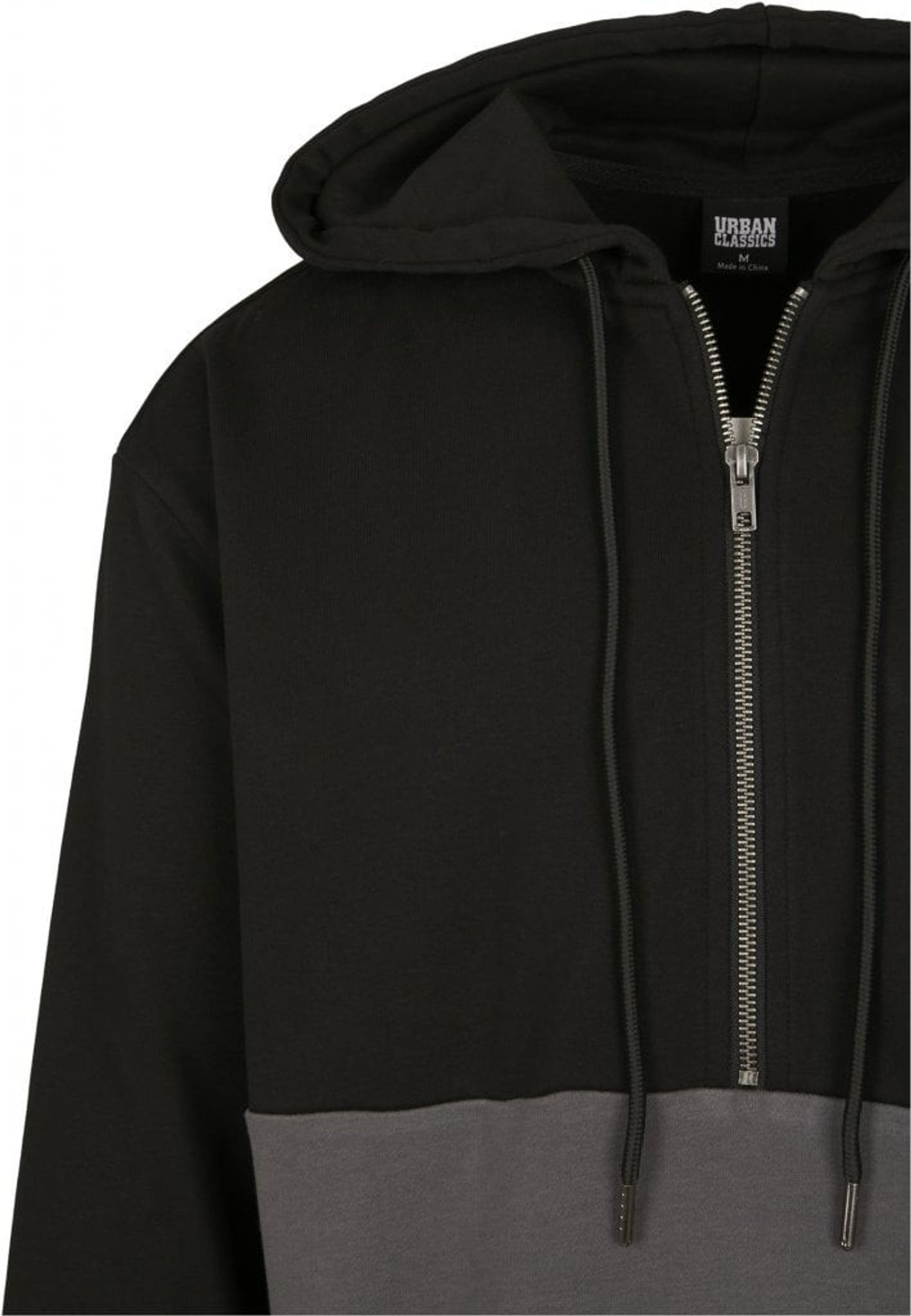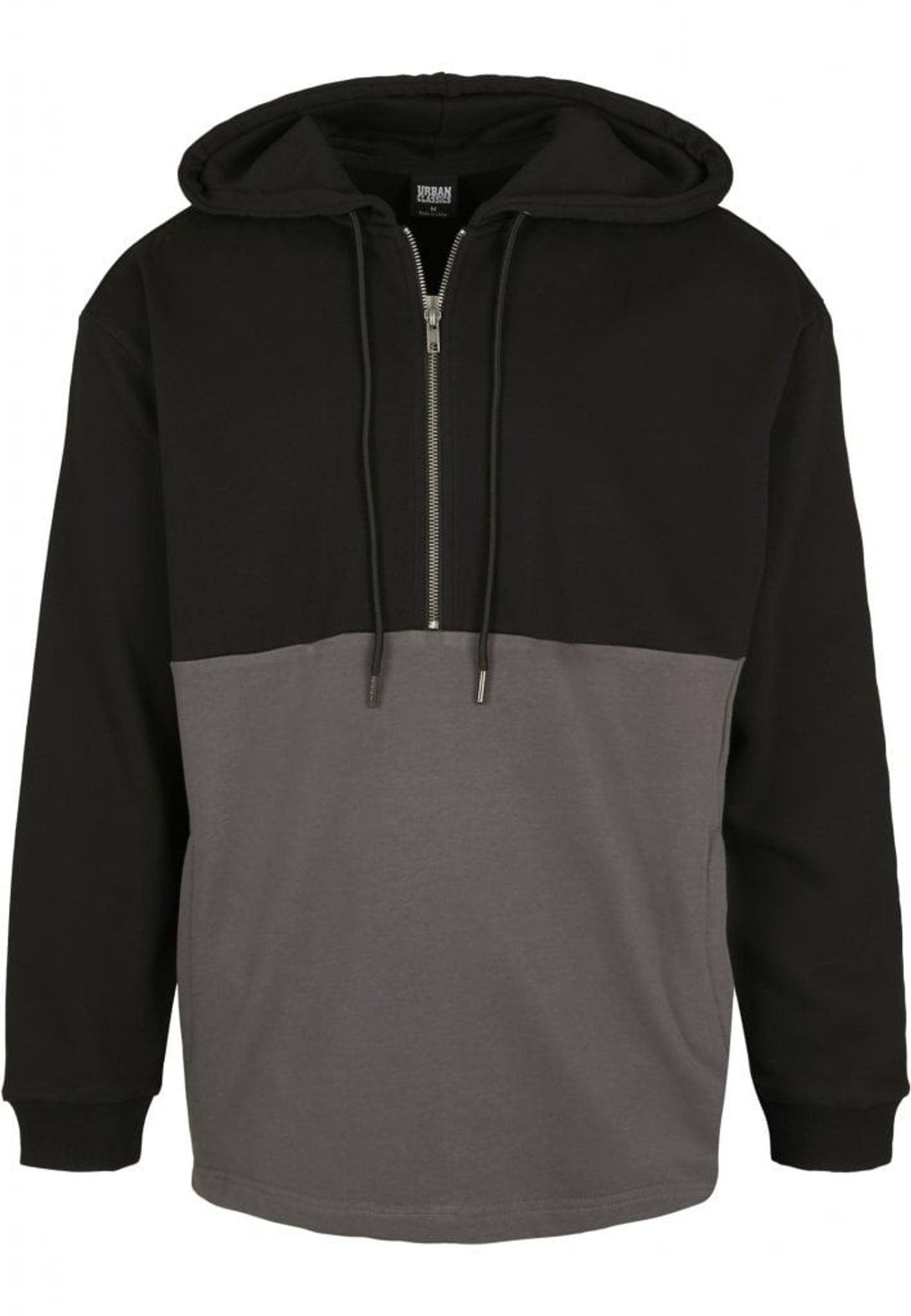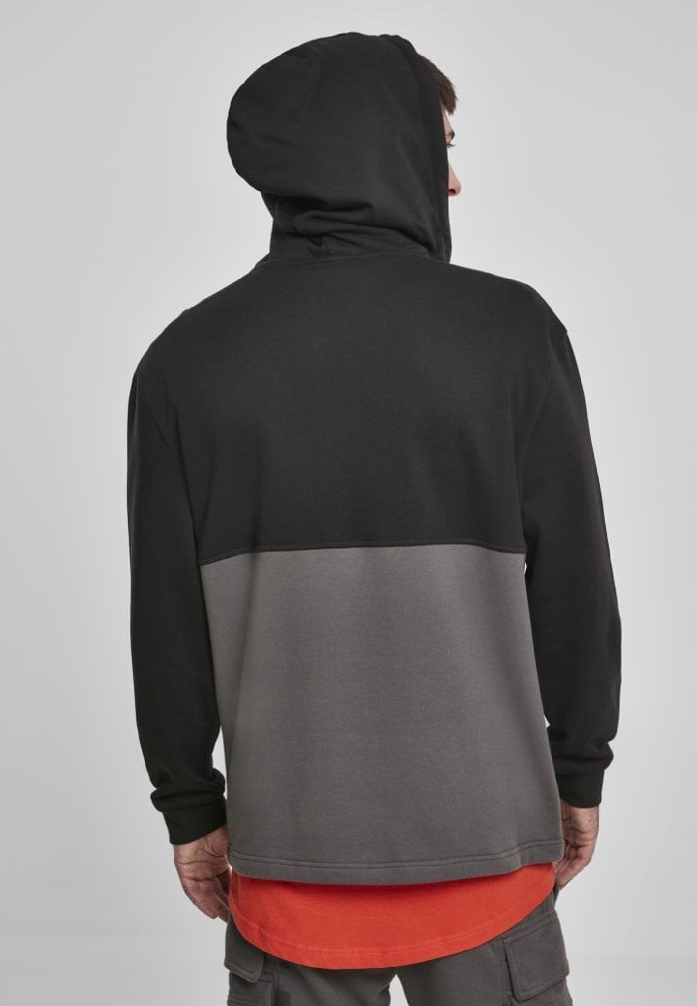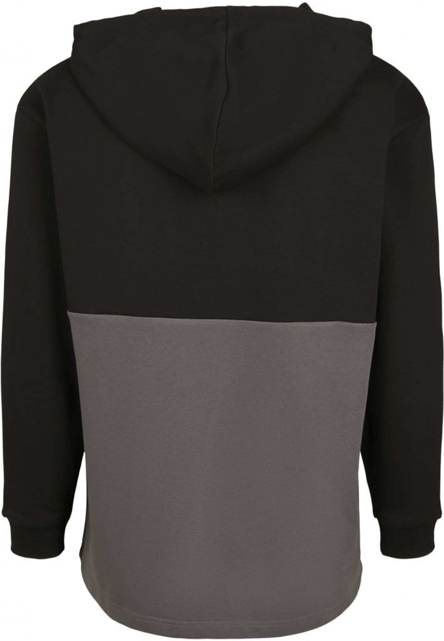 A hoodie with black color at the top and gray at the bottom.