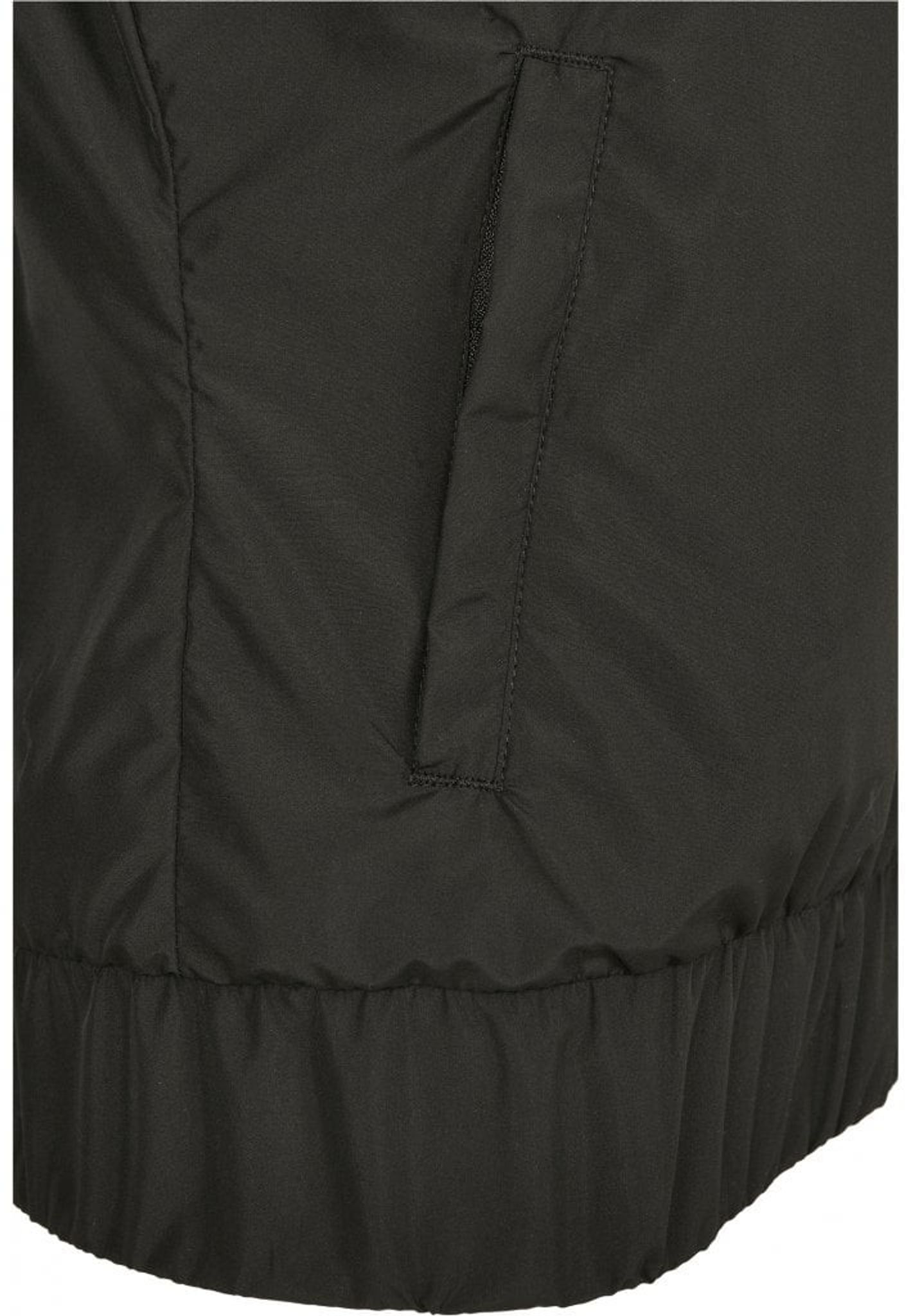 The jacket has two side pockets with a zipper and the bottom edge of the jacket is a wide jacket.