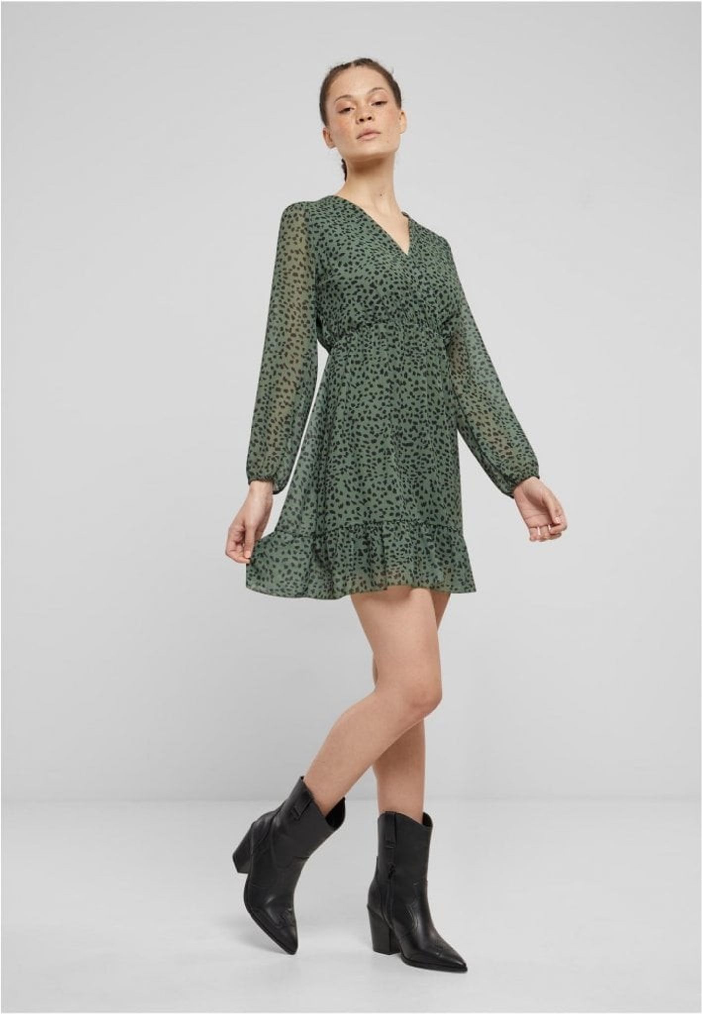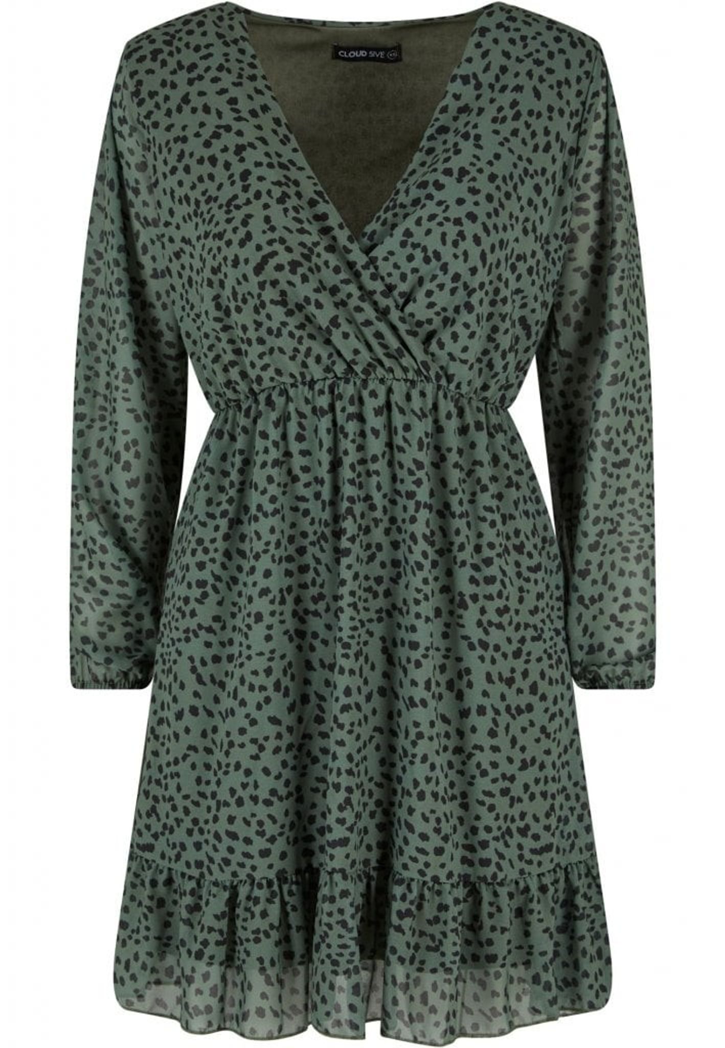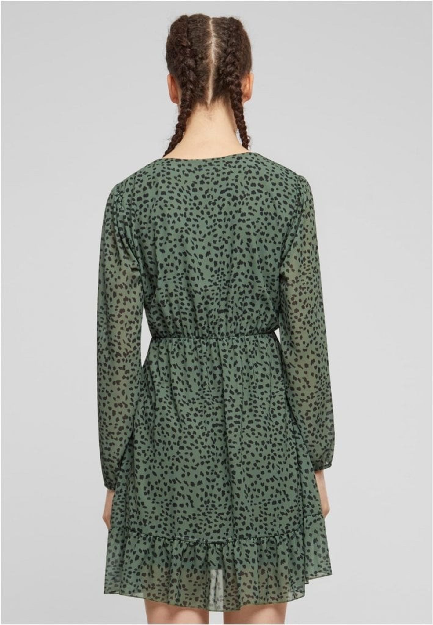 Dress in wild elegance with this V-neck chiffon dress adorned with a playful leopard print. This dress is a real eye-catcher with its distinctive pattern and sophisticated cut. It has a flattering V-neckline that's perfect for accenting jewelry or a pretty scarf. Long, sheer sleeves add a sense of mystery and movement, while the defined waistband creates a defined silhouette that enhances the figure.
