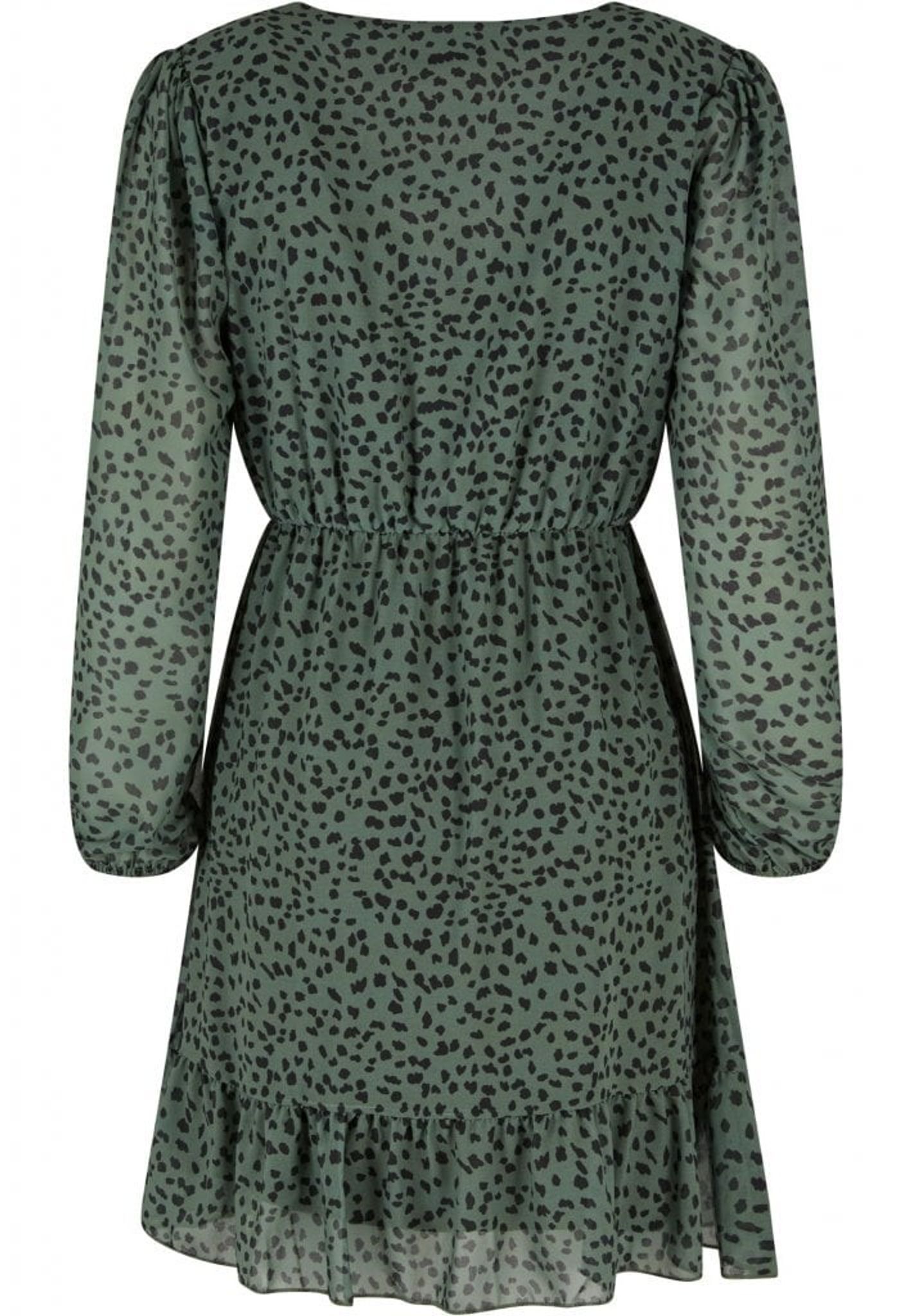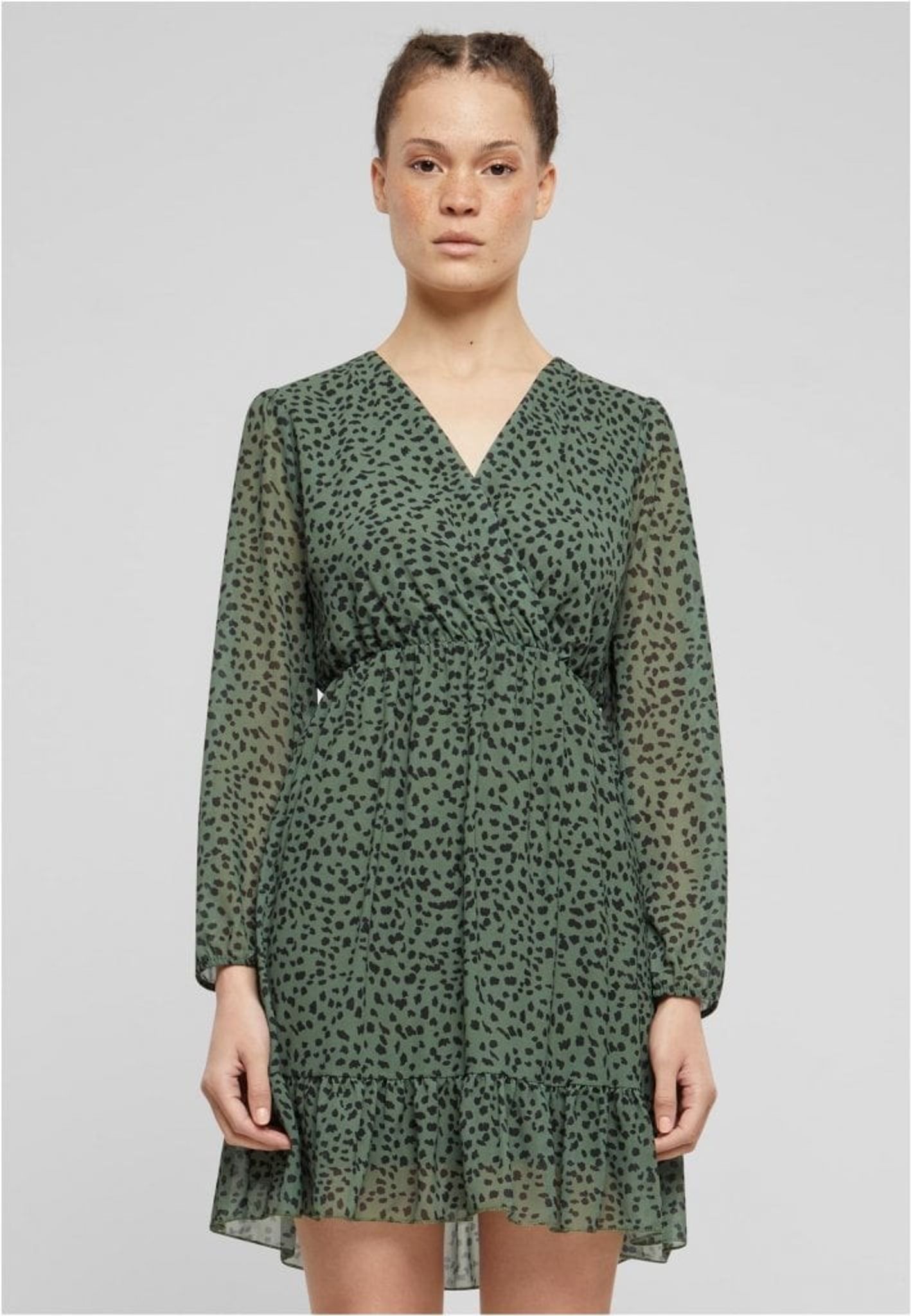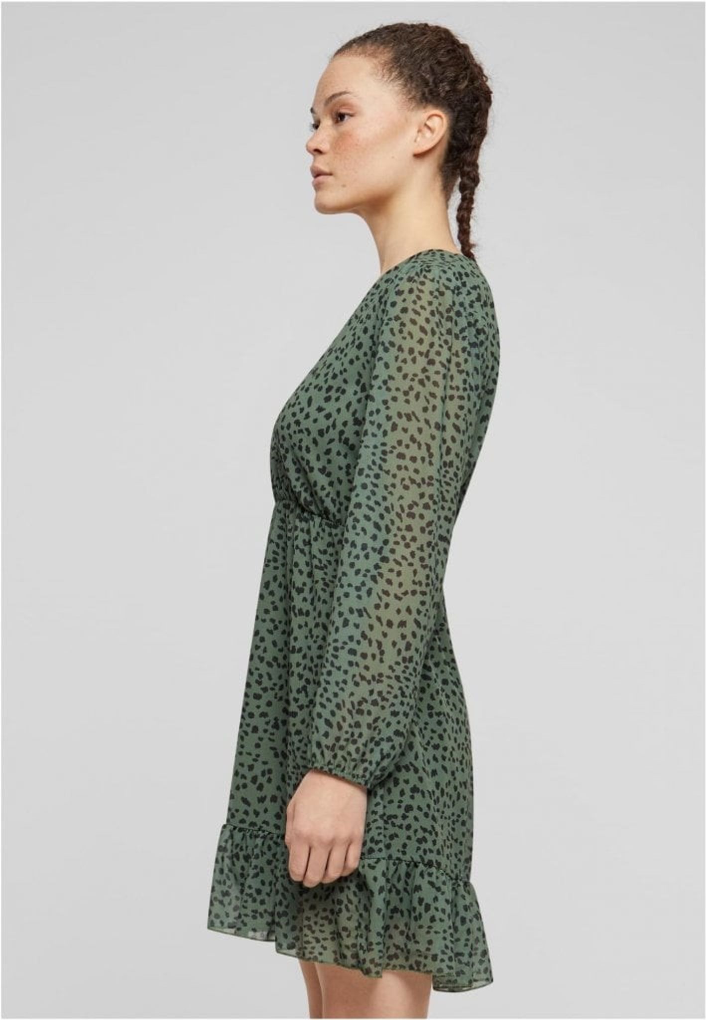 Dress in wild elegance with this V-neck chiffon dress adorned with a playful leopard print. This dress is a real eye-catcher with its distinctive pattern and sophisticated cut. It has a flattering V-neckline that's perfect for accenting jewelry or a pretty scarf. Long, sheer sleeves add a sense of mystery and movement, while the defined waistband creates a defined silhouette that enhances the figure.