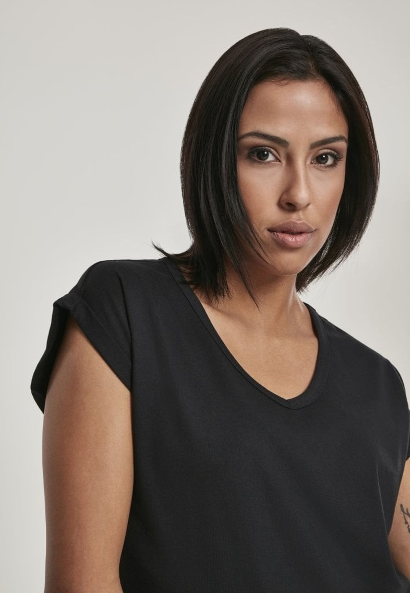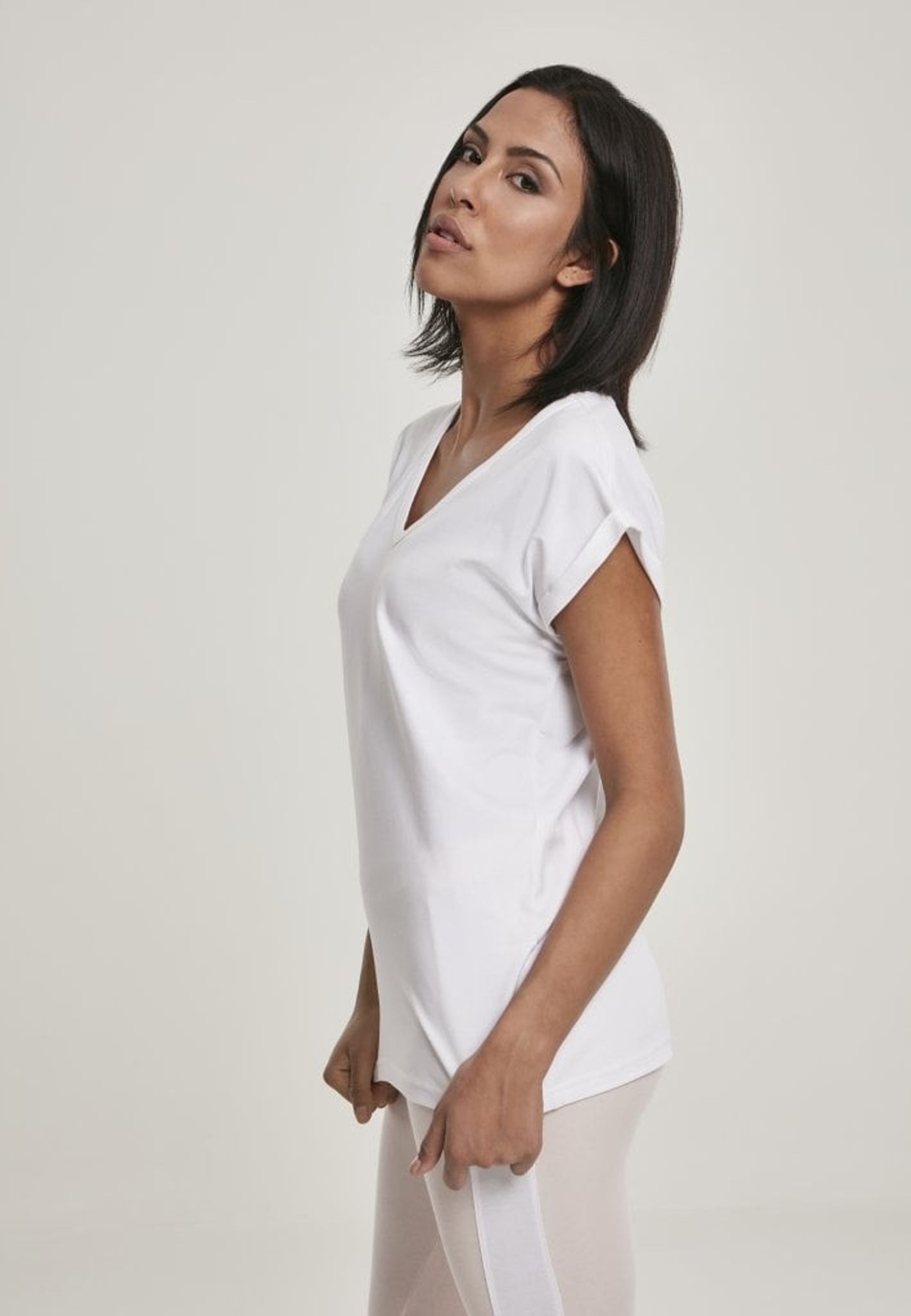 A t-shirt with a deep twisted neck and short rolled up arms.