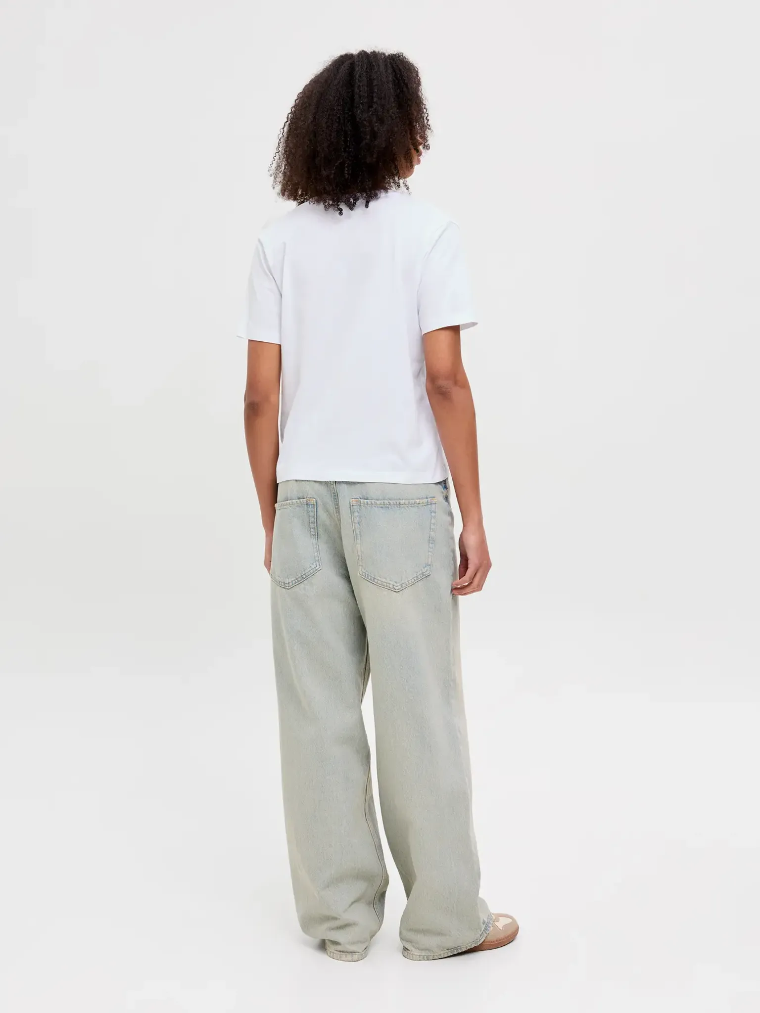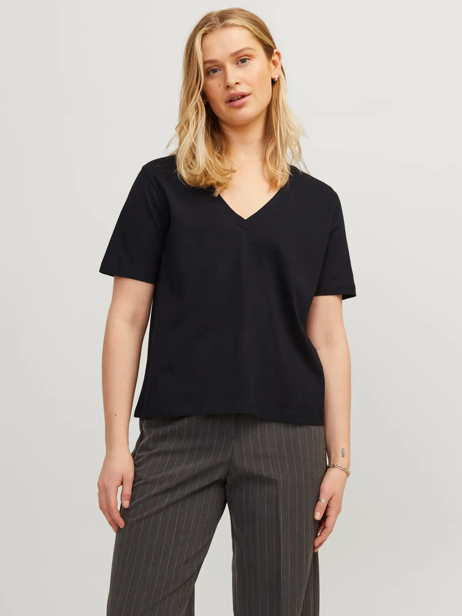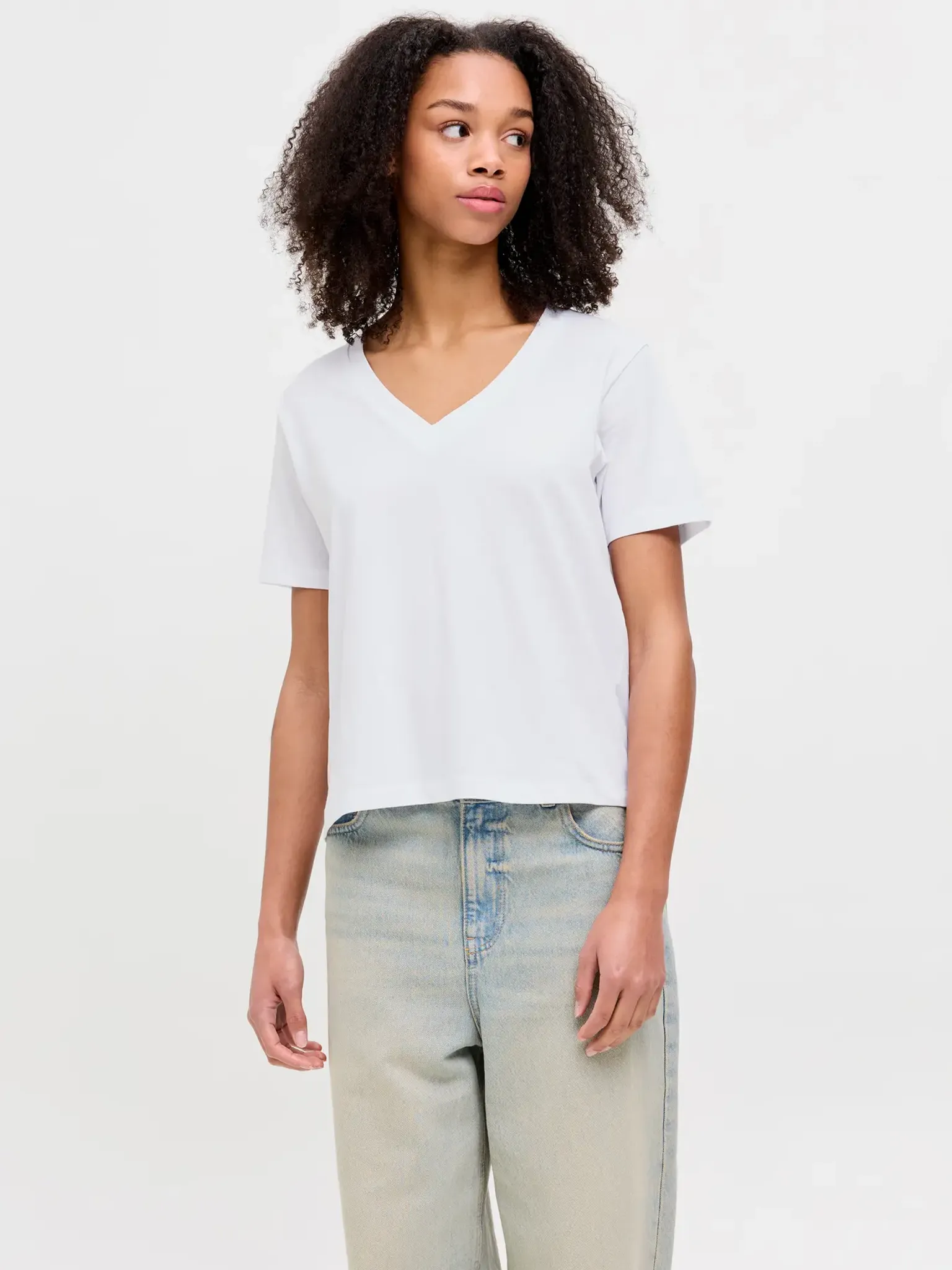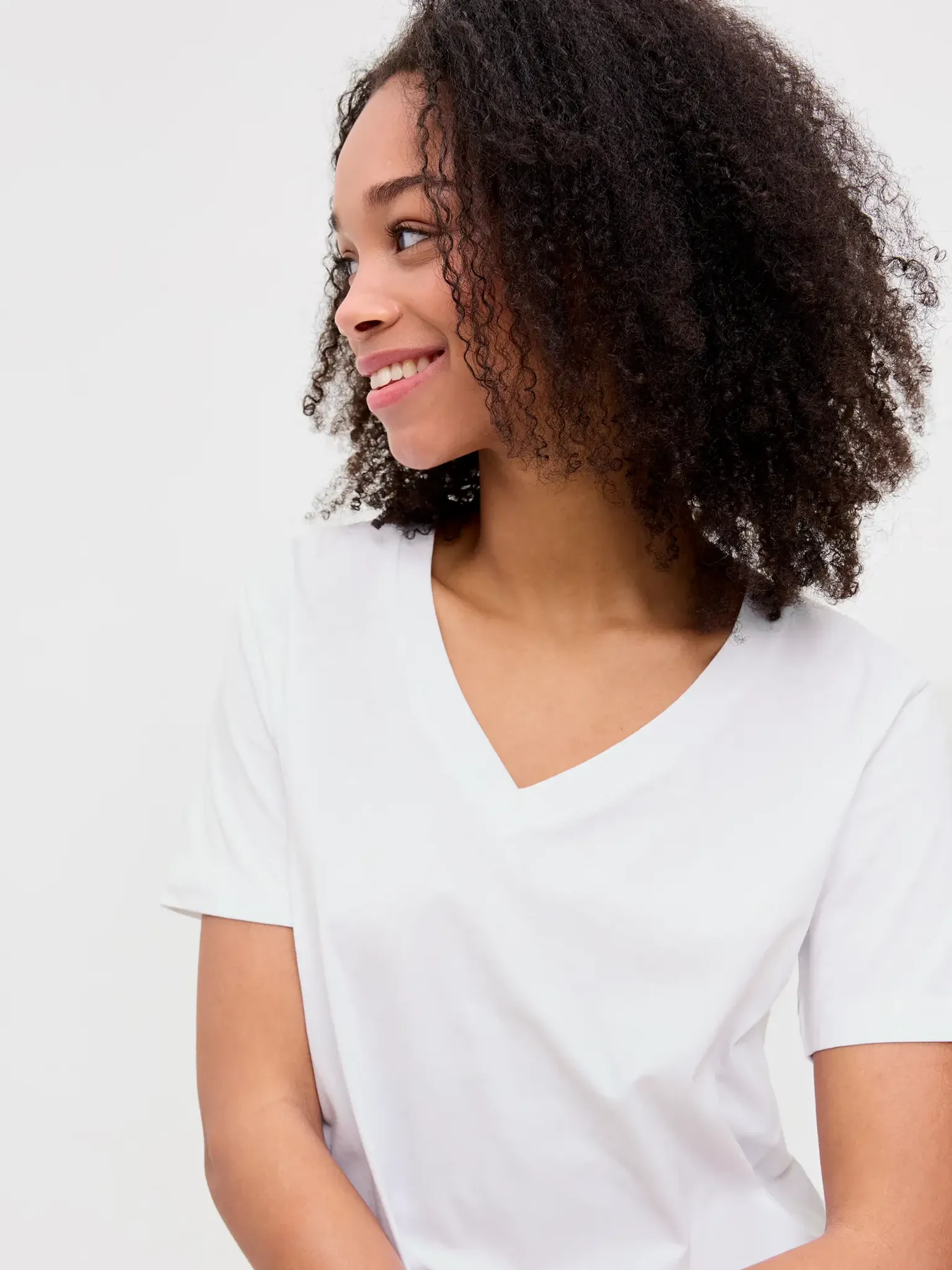 T-shirten har en vanlig passform som ger komfort och rörelsefrihet. Den V-formade halsen ger en elegant touch, medan de korta ärmarna gör den idealisk för varma dagar.