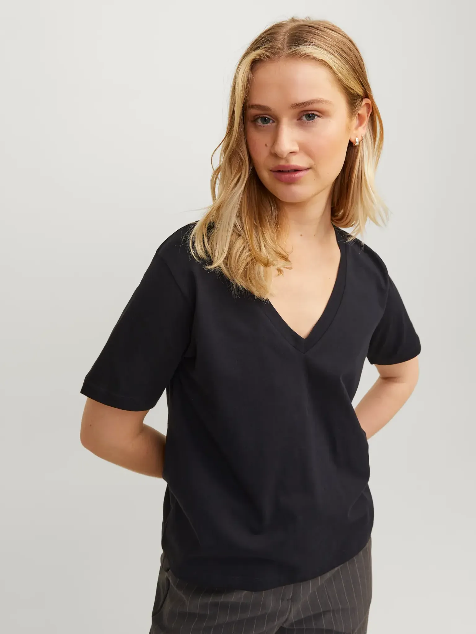 Denna V-ringade t-shirt med kort ärm är en grundläggande del av garderoben, perfekt för en avslappnad stil. Den passar utmärkt tillsammans med jeans, shorts eller byxor.