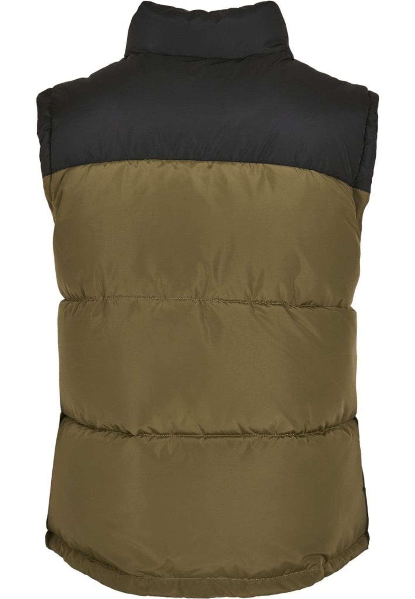 This vest closes with a zipper at the front and has a stand-up collar. The zipper goes up in the collar.