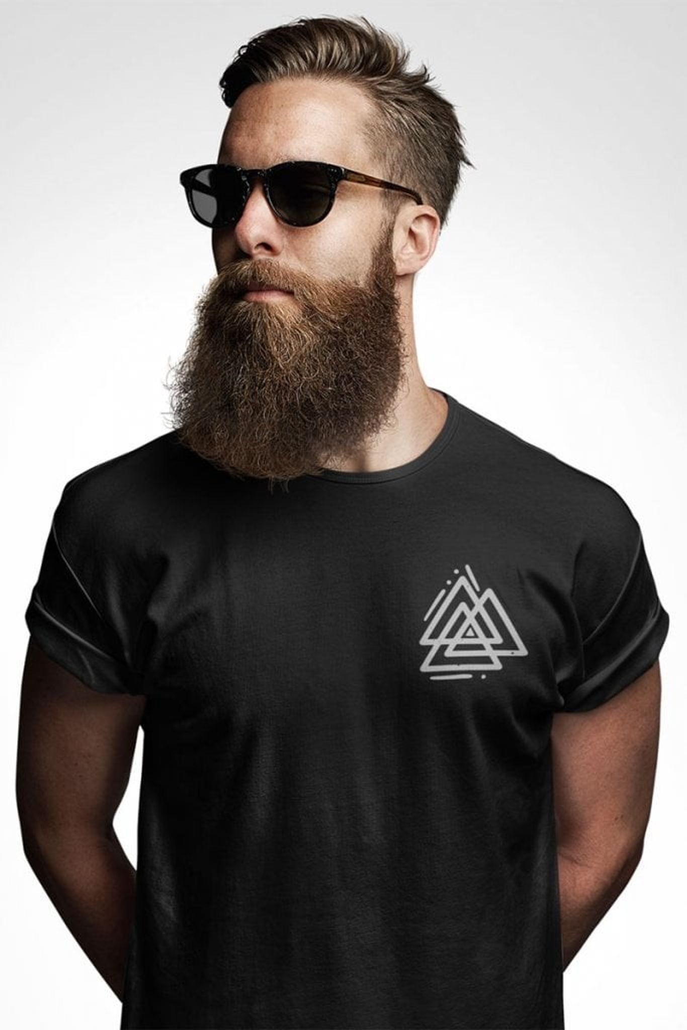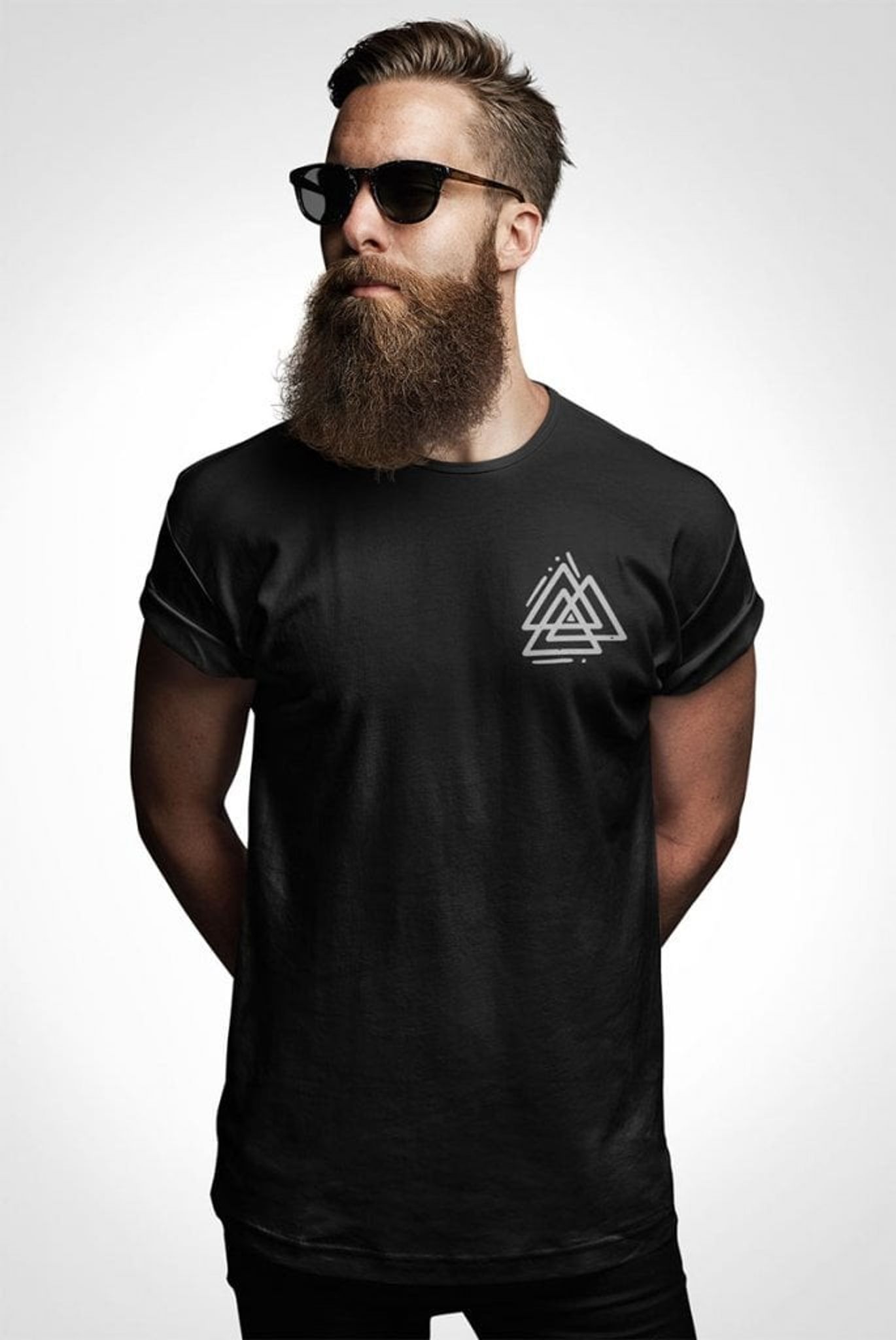 T-shirt with the Old Norse symbol Valknut. The whale knot consists of three connected triangles. Other names for the whale knot are Den slagne's heart, Vala's heart, Rungner's heart or Odin's knot.