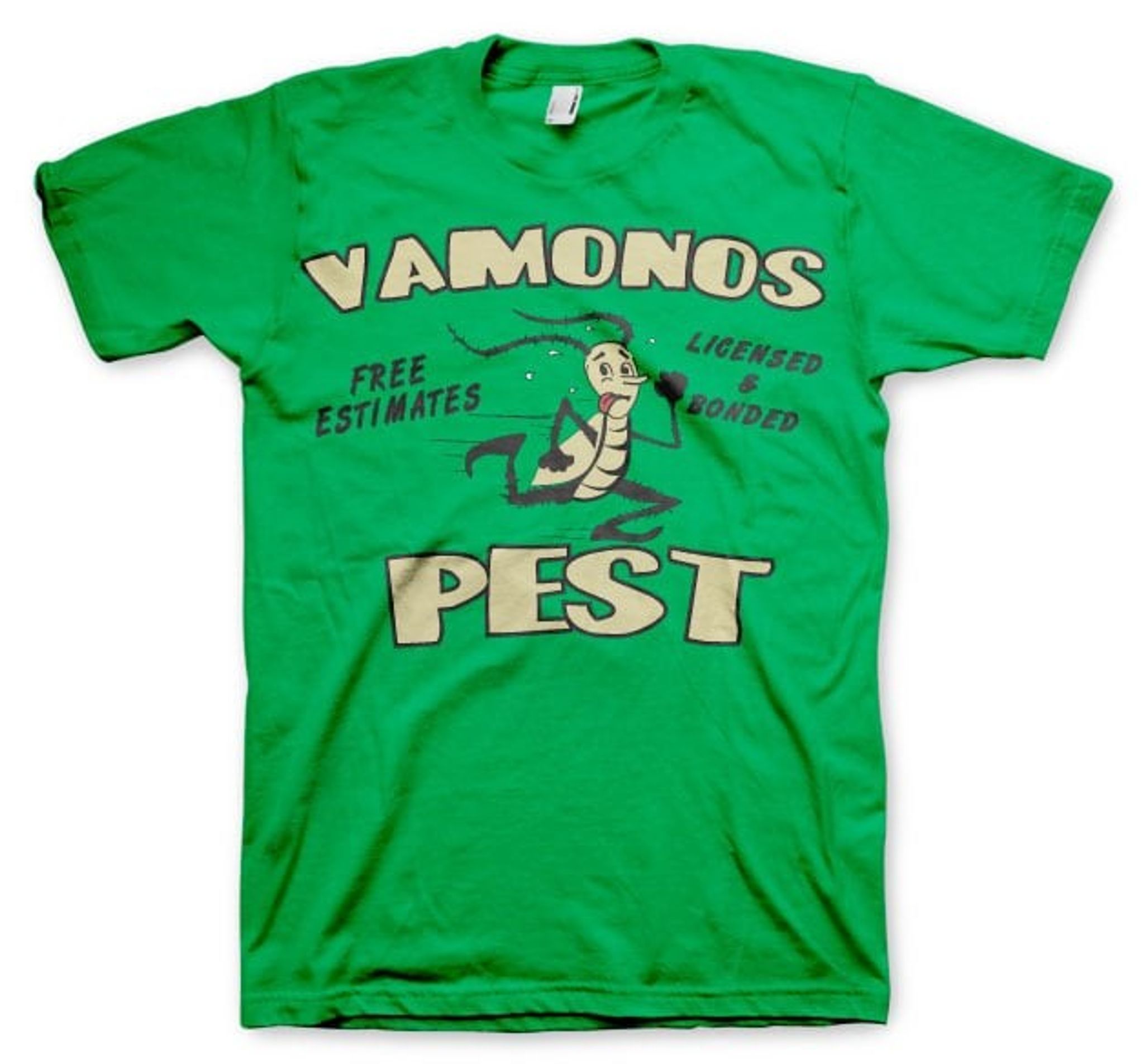 This Vamanos Pest T-shirt really has a unique motif! A costumed cockroach with the corporate logo from "Breaking Bad" takes pest control to a new level.
