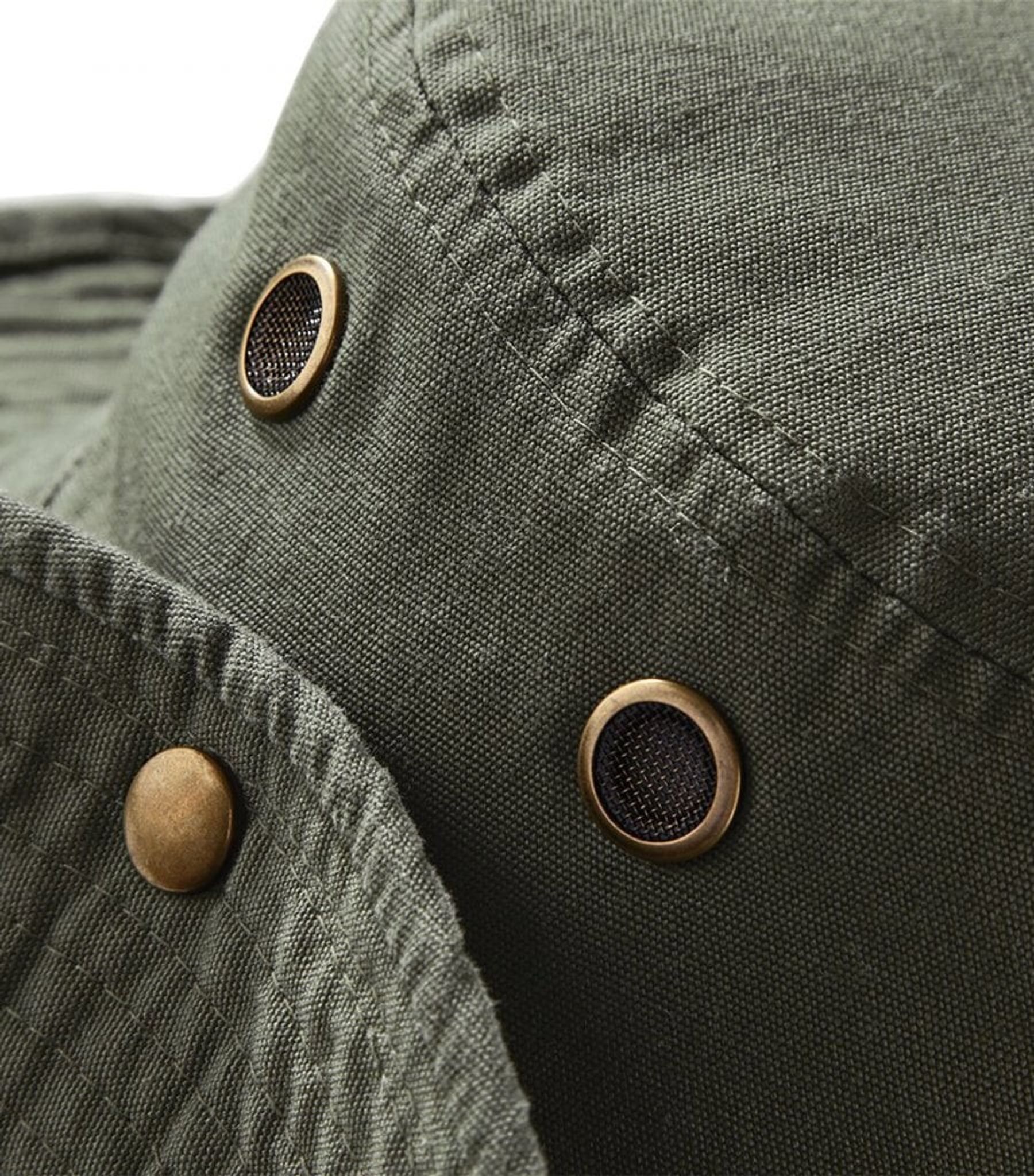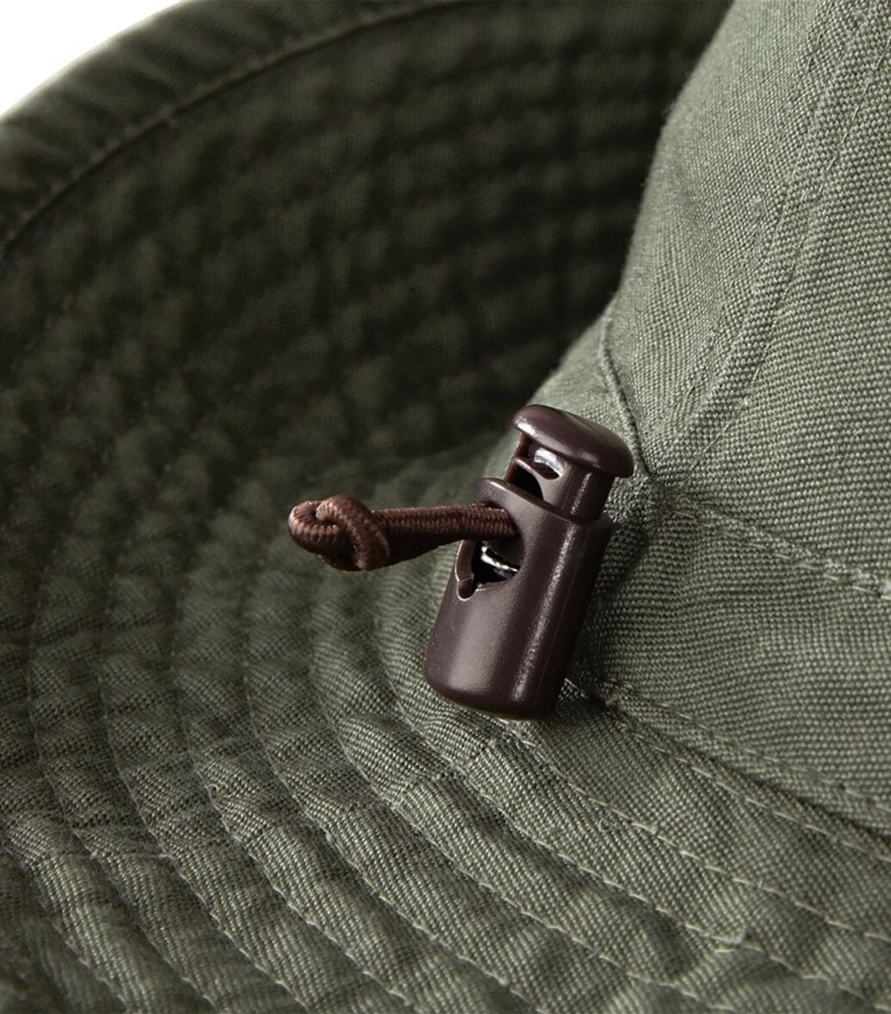 The sides of the board can be attached with push buttons. The hat also has a chin strap with leather strap.