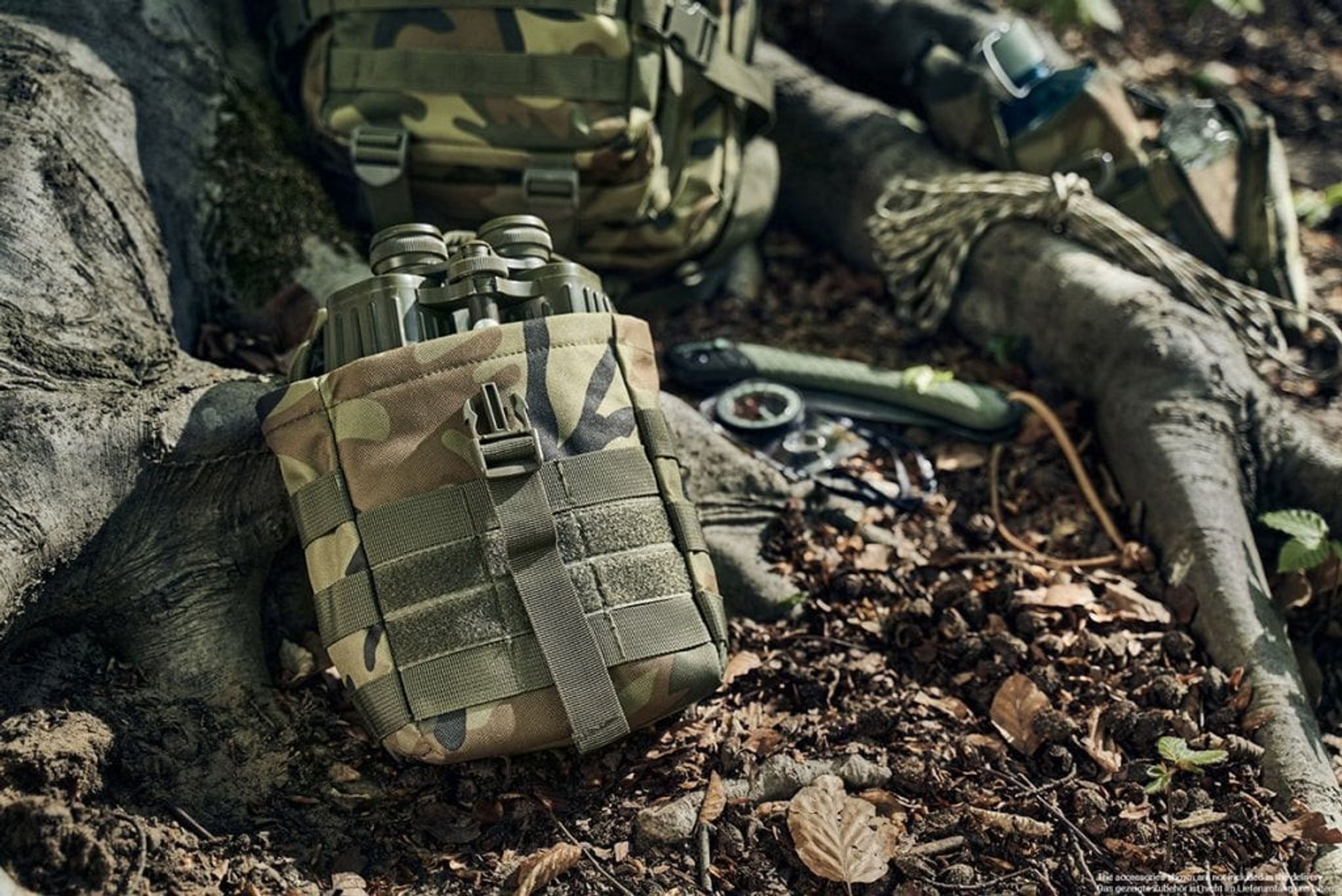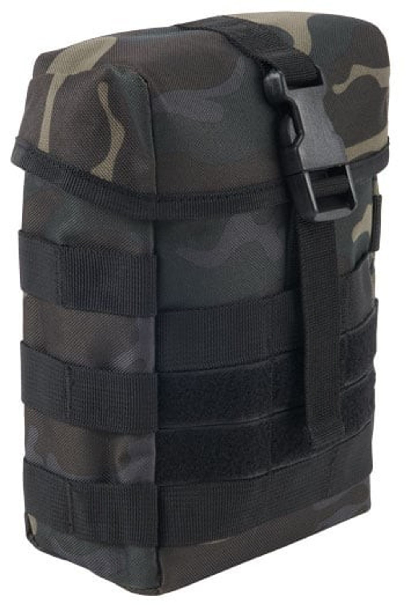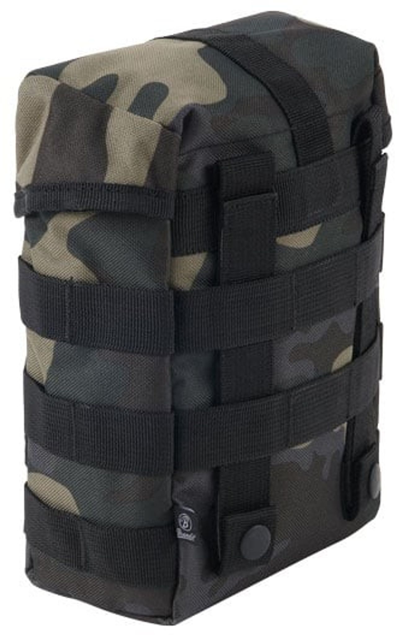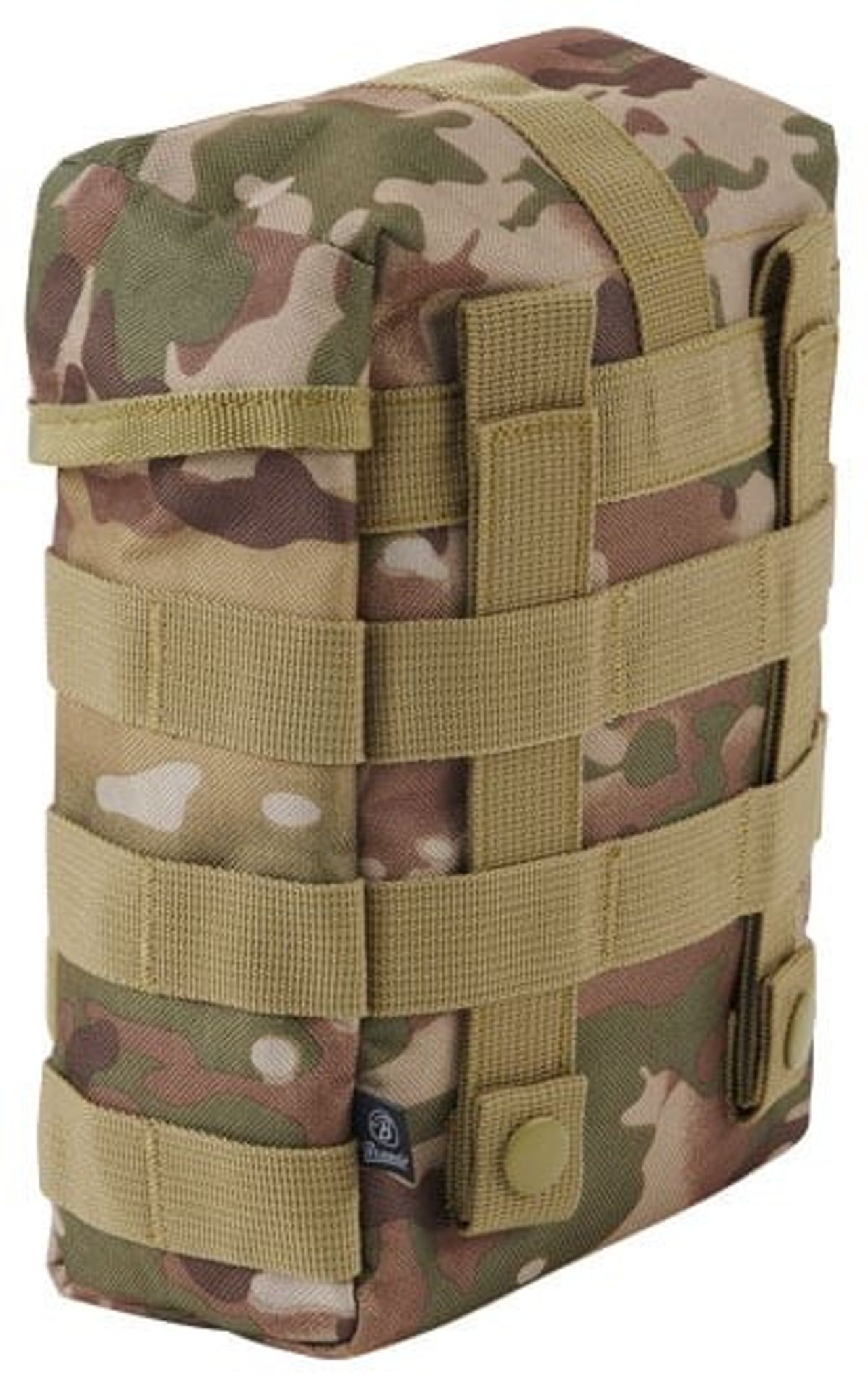 En lille rummelig taske udstyret med fastgørelseselementer til fastgørelse på rygsække eller lignende med MOLLE-system. Tasken kan også fastgøres direkte på et bælte.