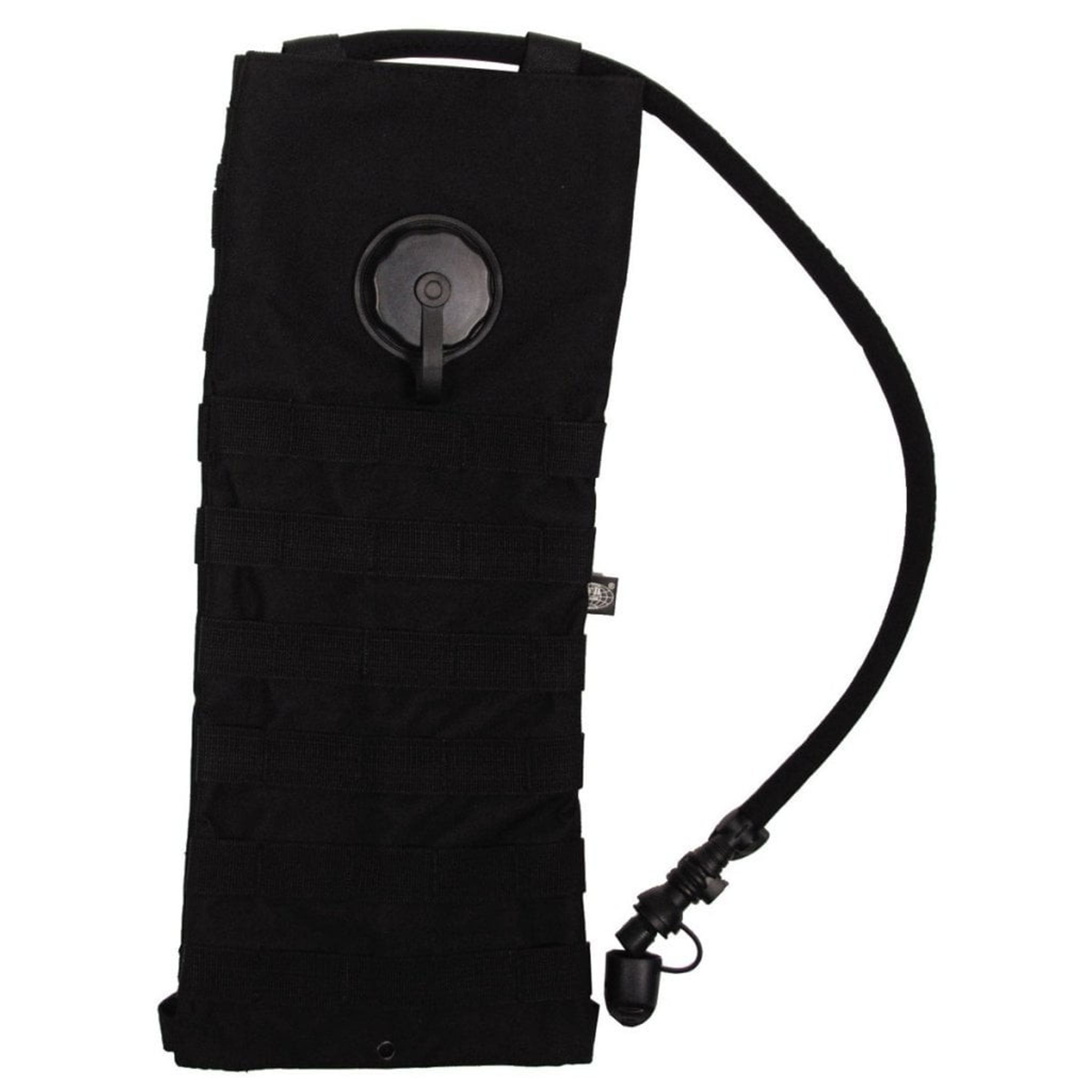 A black liquid backpack that holds about 2.5 liters of water. The backpack has a hose with a nozzle that makes it possible to consume the water while carrying the backpack on the back.