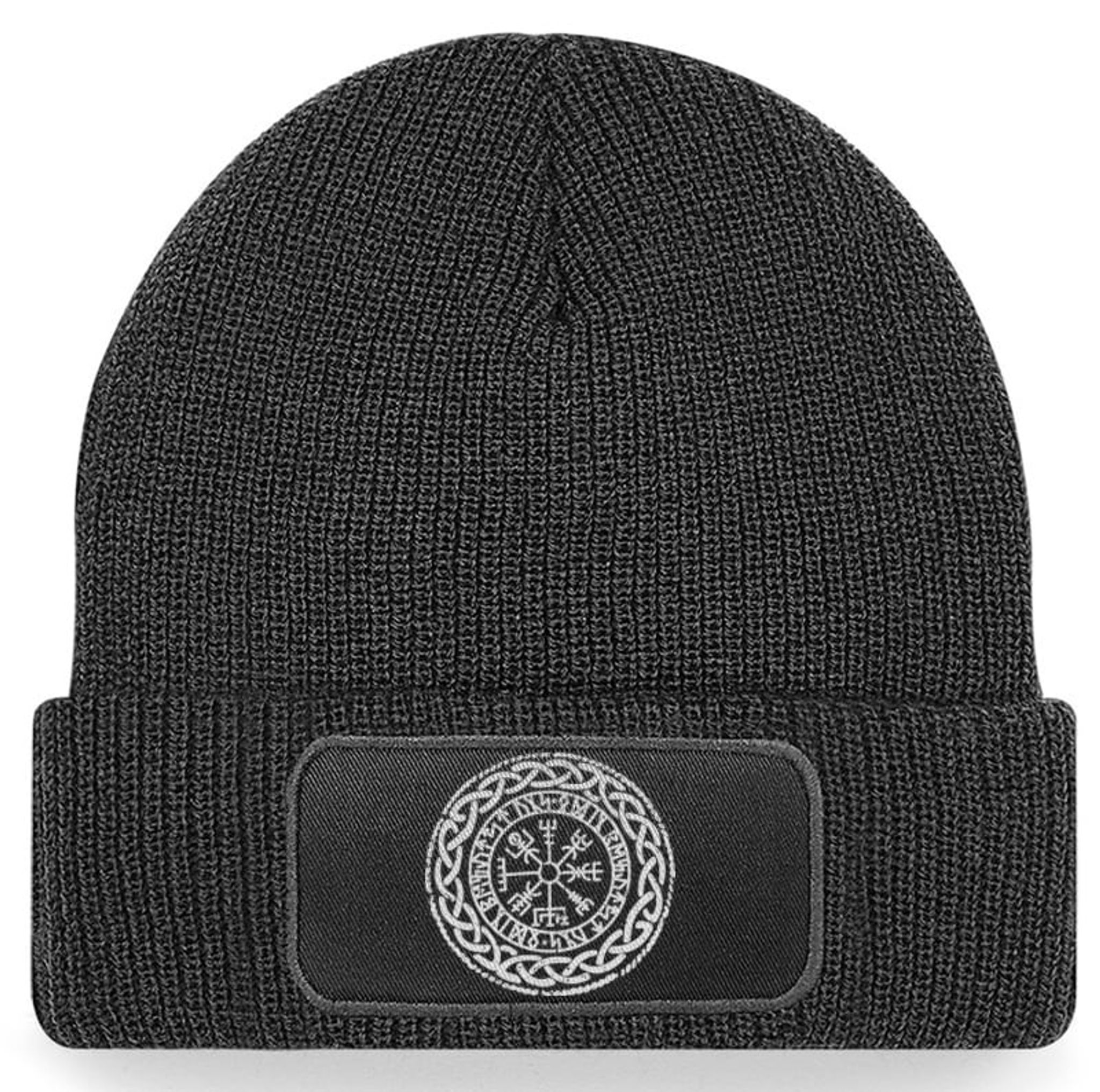A really soft and lovely hat with a fabric patch on the folded edge. The patch then has a printed motif with a Celtic ring and in the middle is a Viking compass, also called Vegvisir.