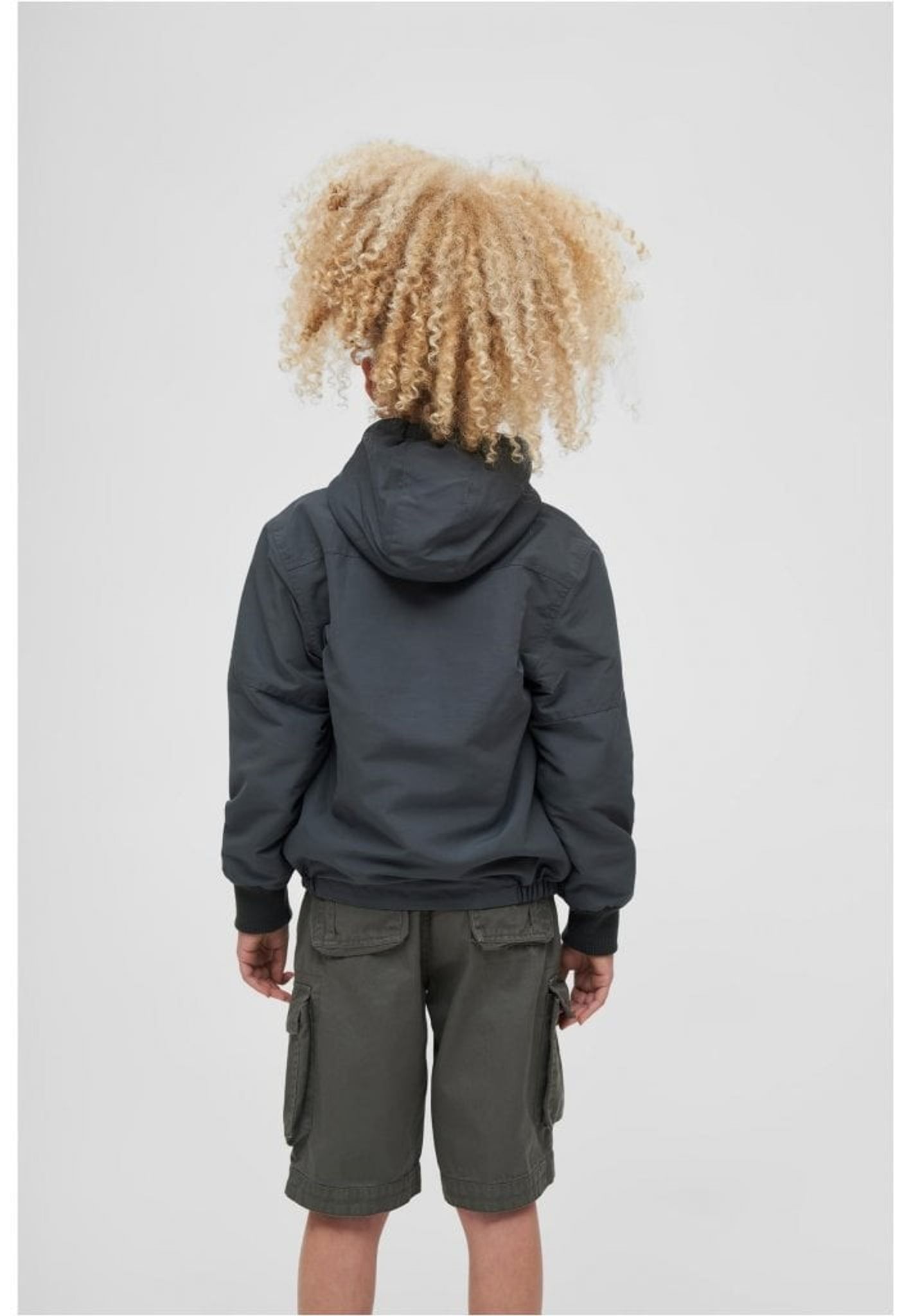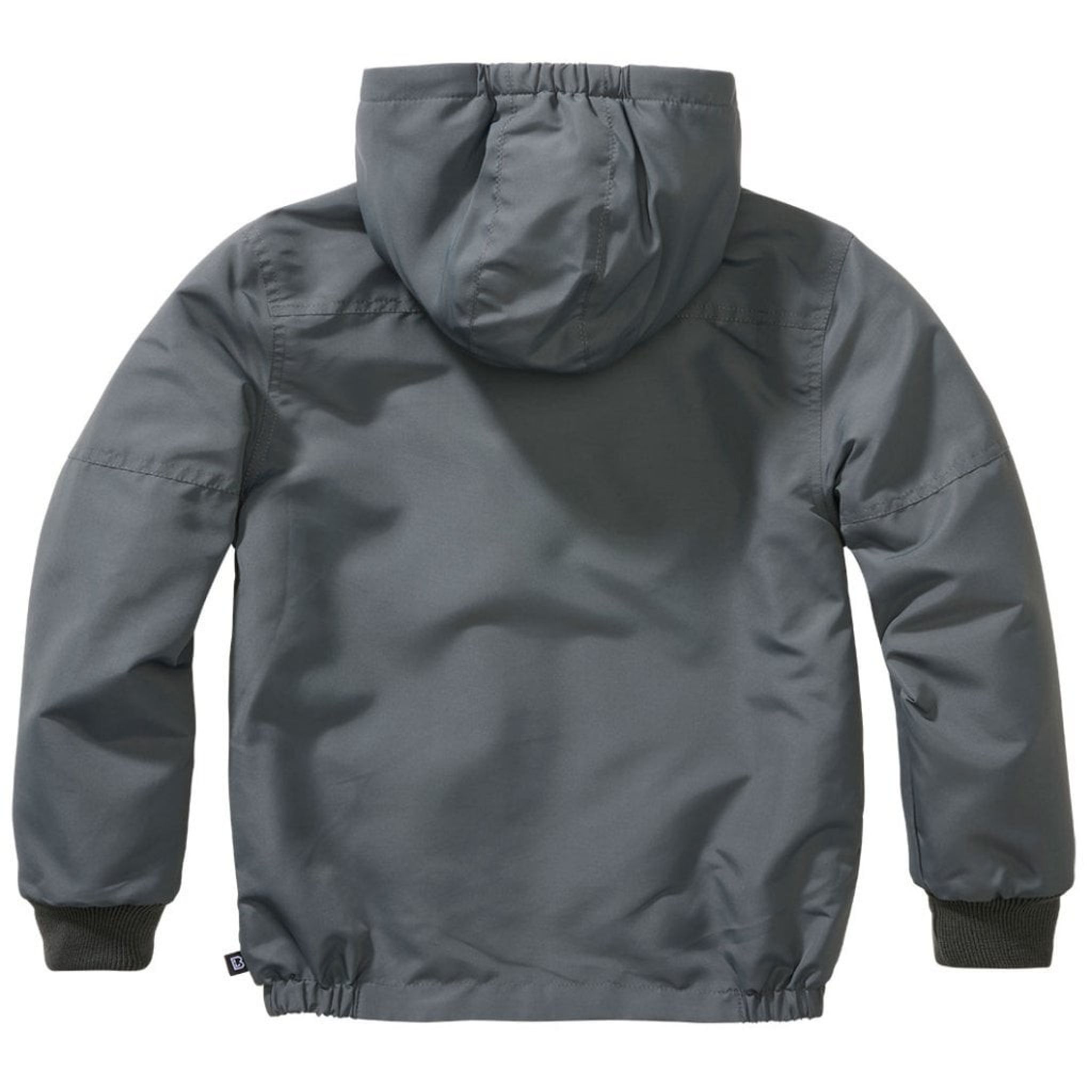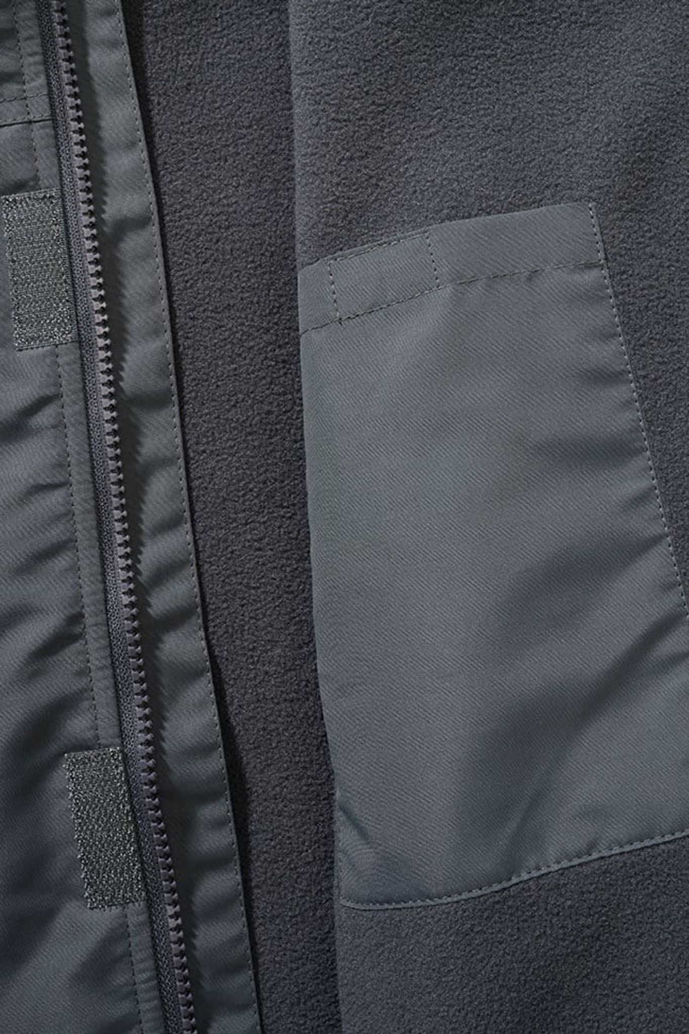 A gray windbreaker with a water and wind resistant outer fabric. The inner fabric is a warm and soft fleece lining that insulates and keeps the heat against the body. The jacket is opened and closed with a zipper and the zipper is protected by a wind stop that is closed with Velcro. This prevents wind and water from squeezing in between the zipper teeth.
