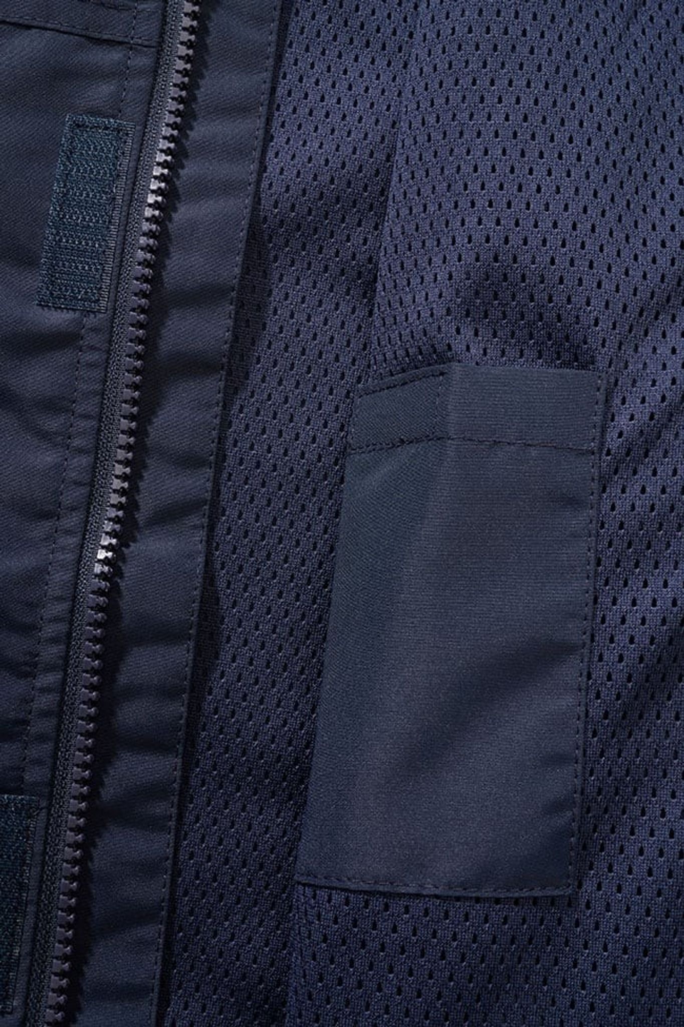 The jacket has two side pockets and an inner pocket. The side pockets are closed with a zipper and the inner pocket is closed with Velcro.