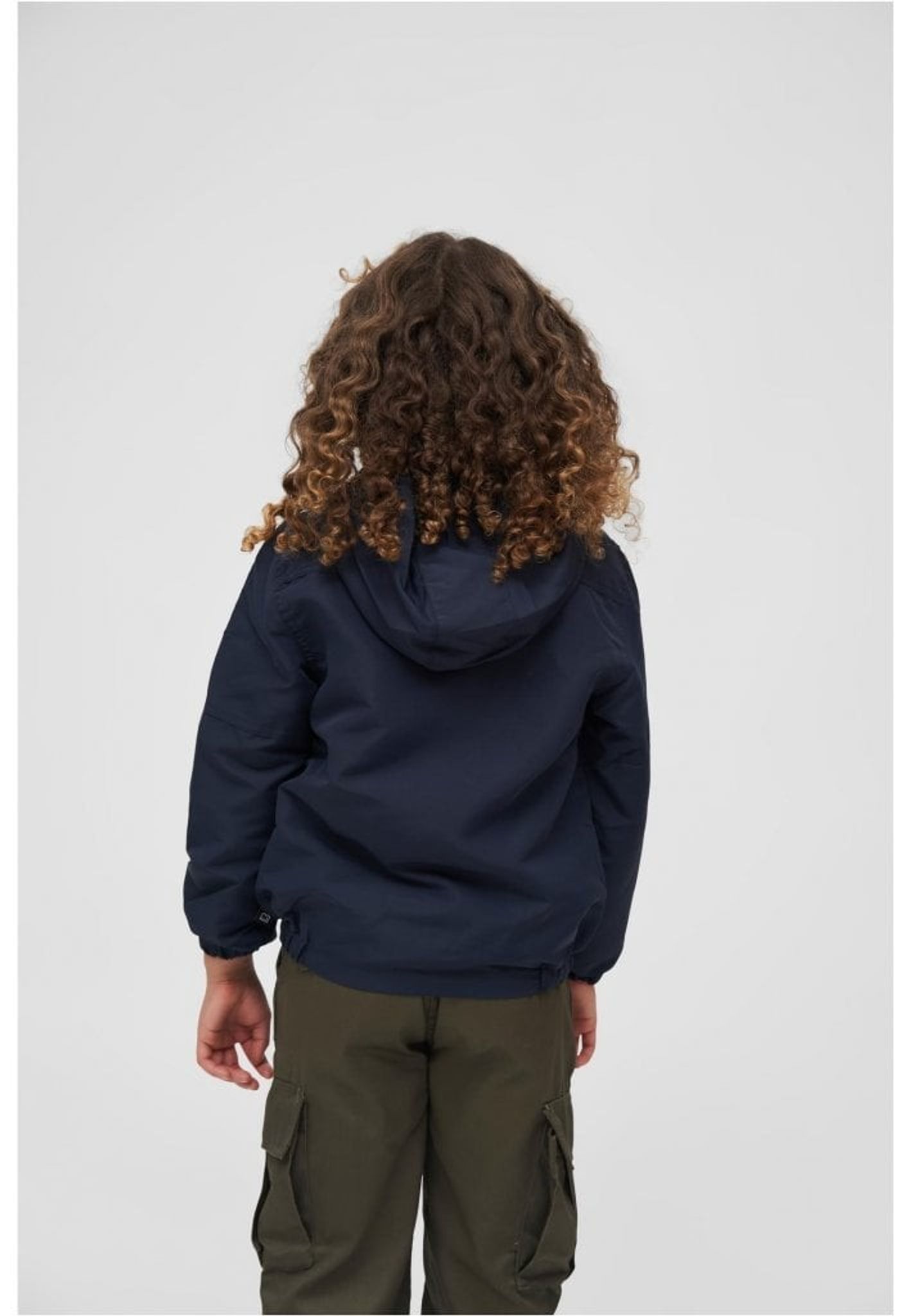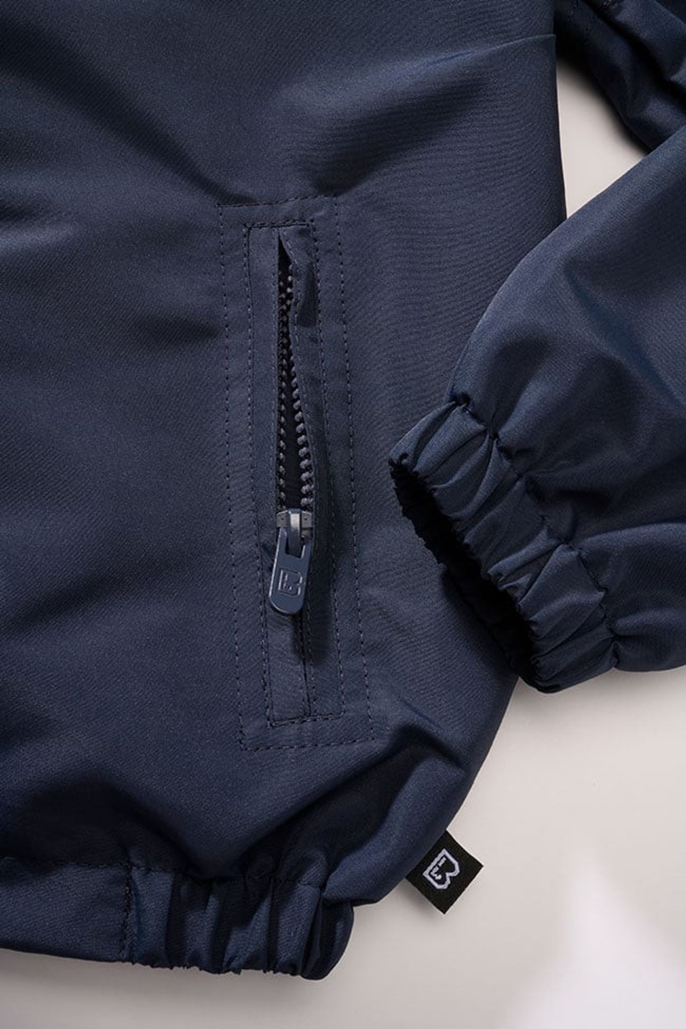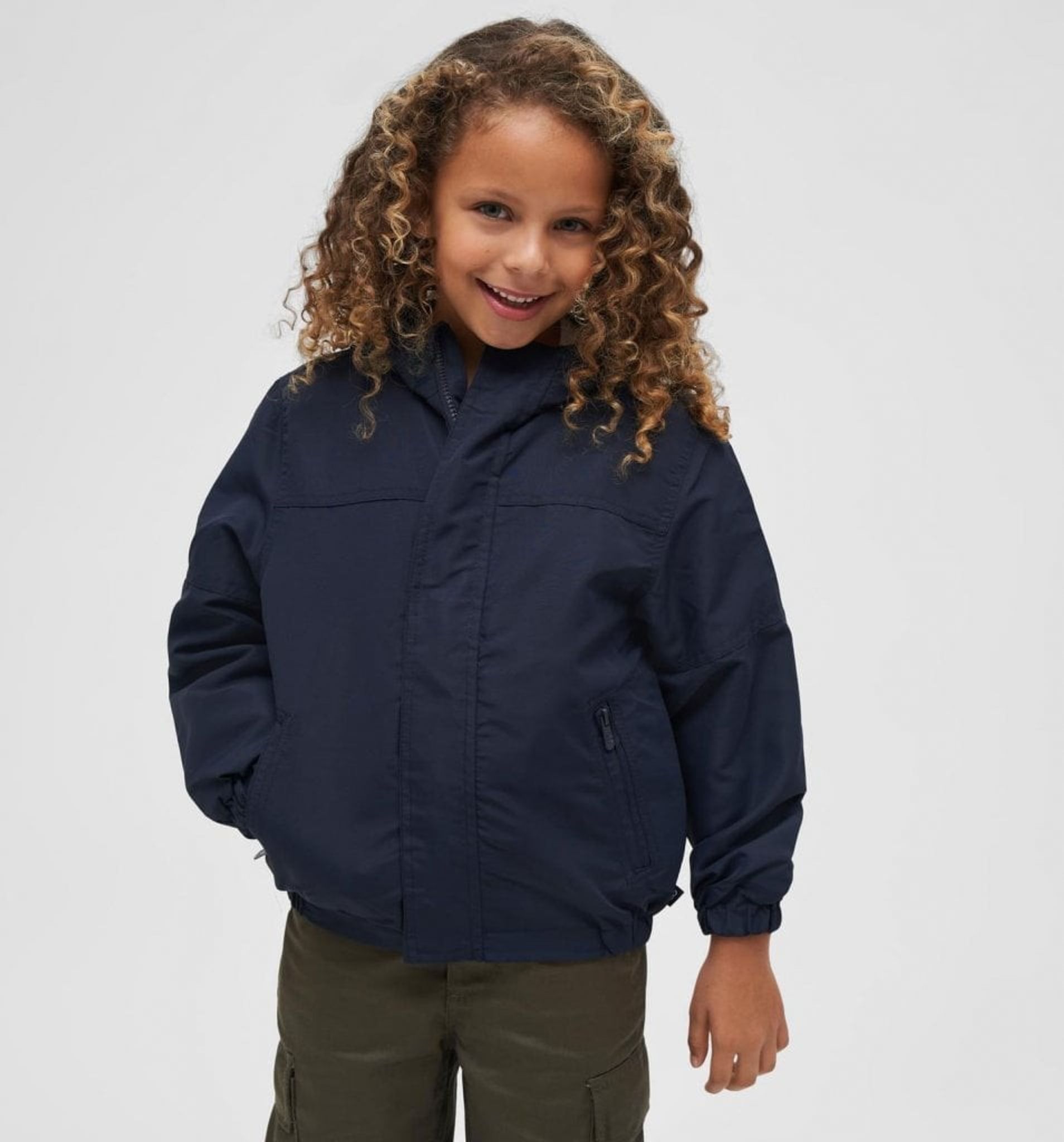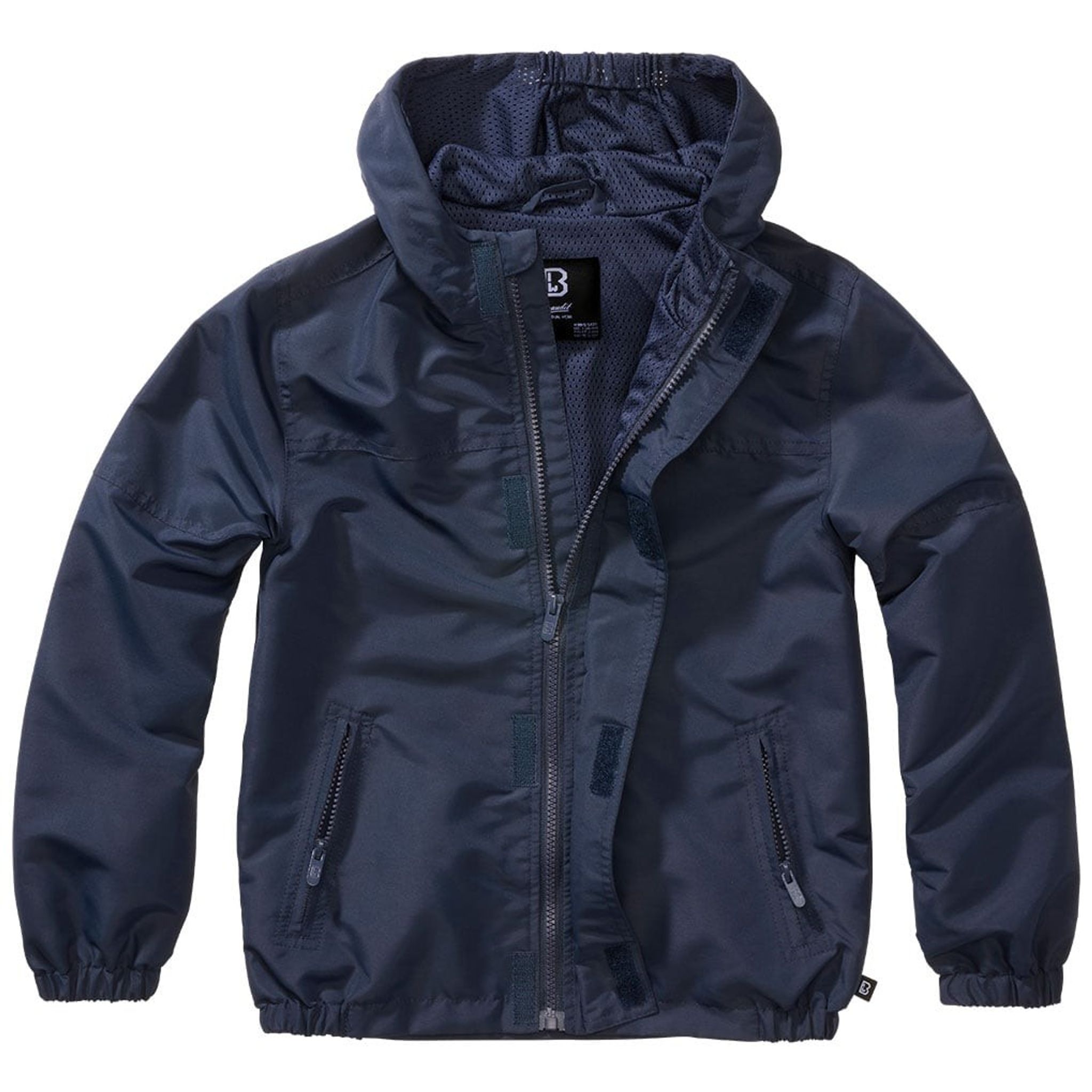 A navy blue windbreaker with a shell that is resistant to both wind and water. The mesh lining has a good breathability.
