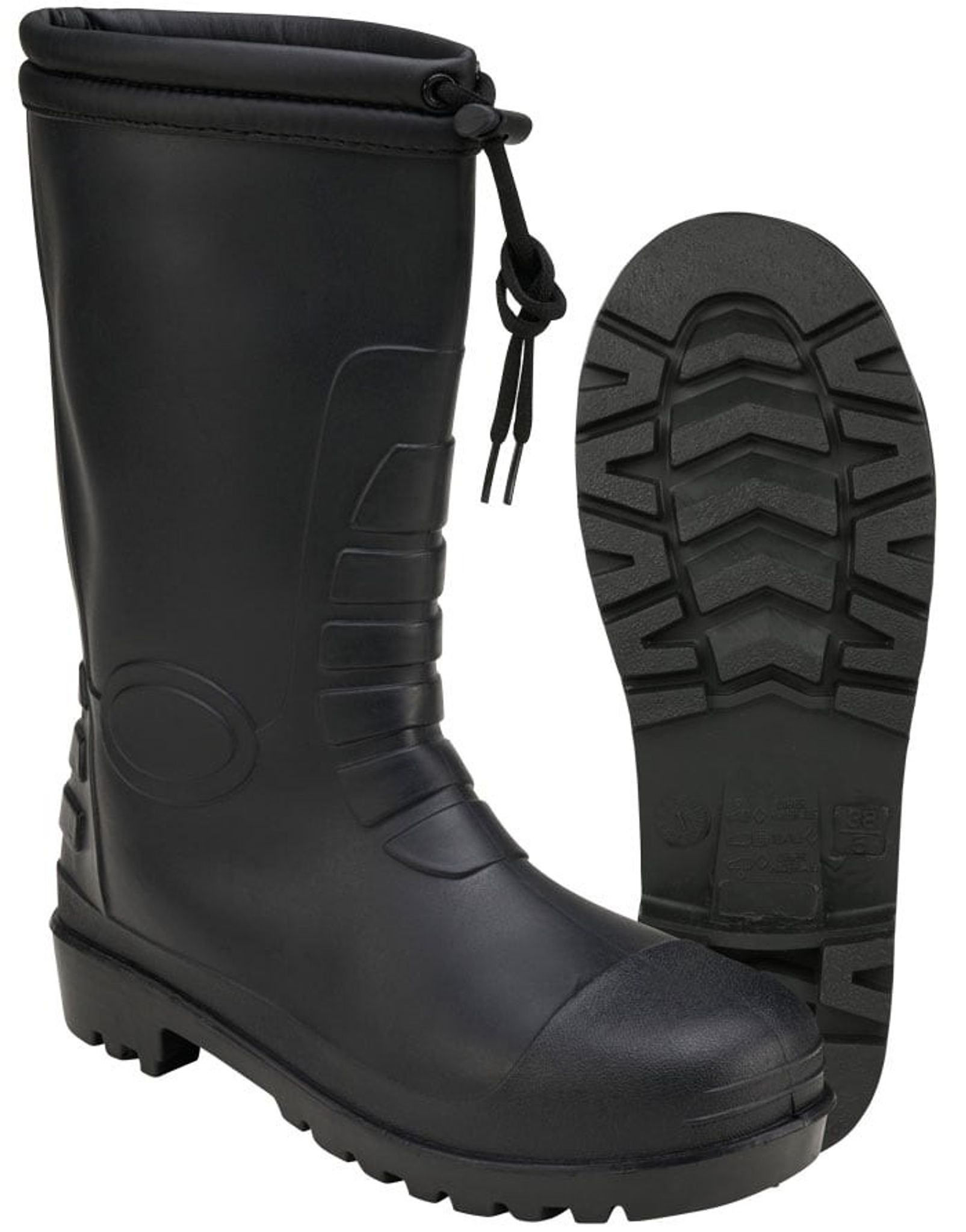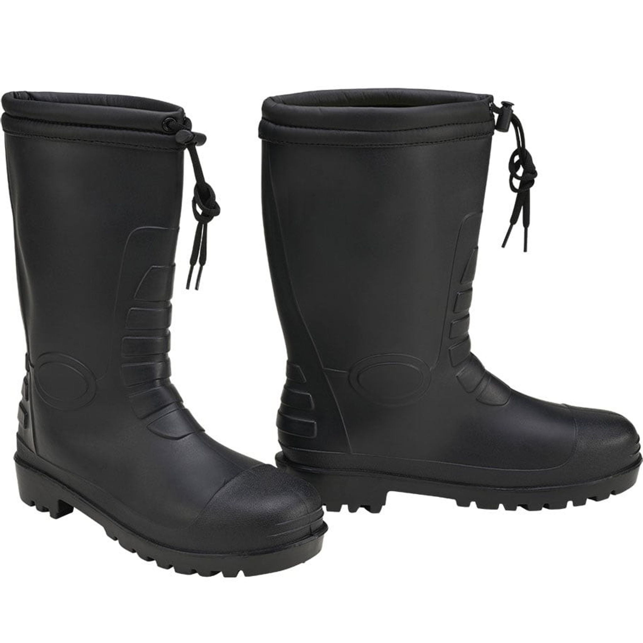 A pair of high quality black rubber boots with an inside lined in a warm and insulating teddy lining. In other words, the boots help you keep your feet dry and warm.