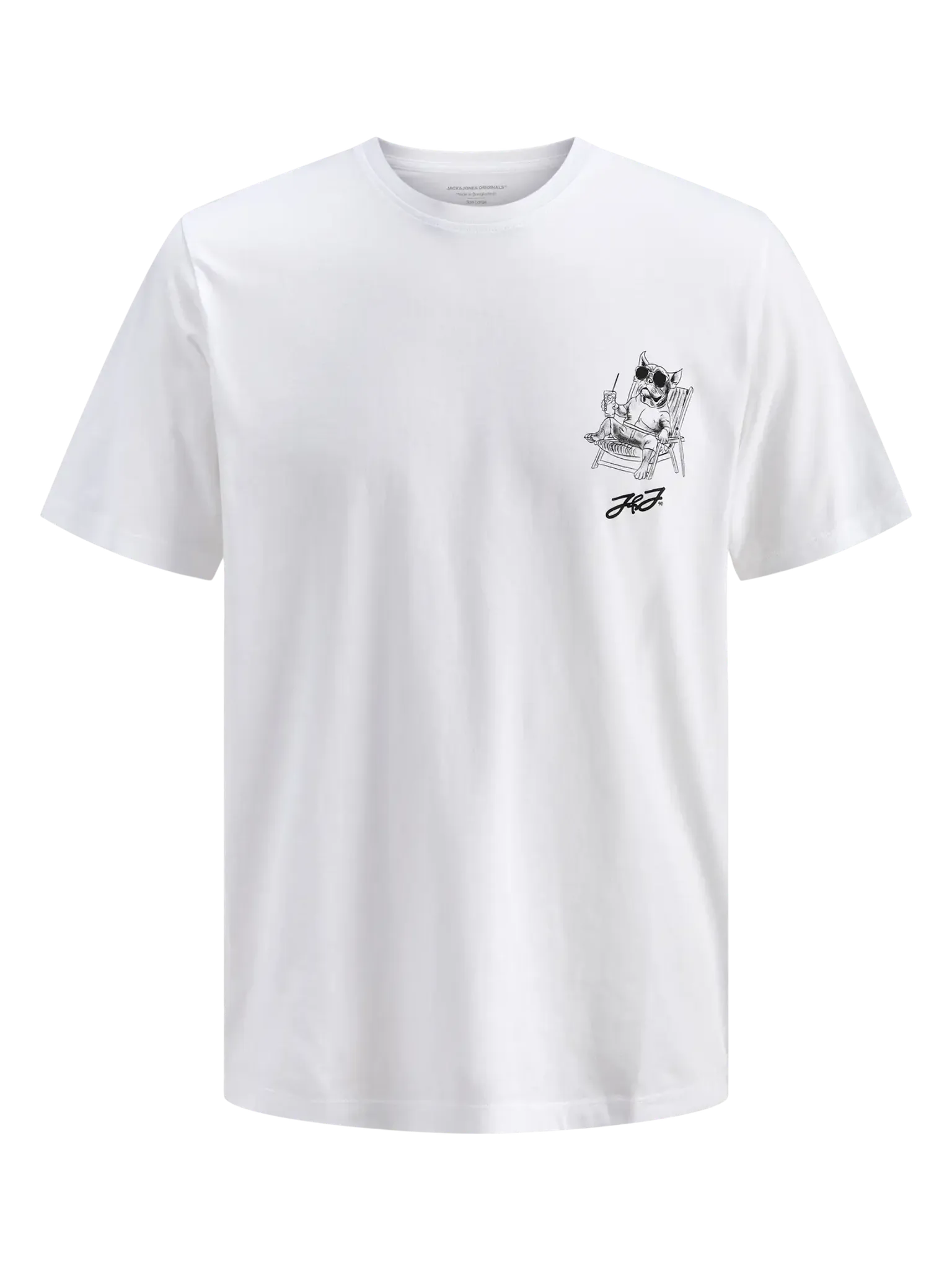Det här är inte bara en vanlig vit T-shirt – det är ett plagg med personlighet. På bröstet sitter en avslappnad bulldog med solglasögon och drink i handen, ett tryck som fångar den där sköna "jag gör vad jag vill"-attityden. Perfekt för dig som gillar kläder med karaktär.
