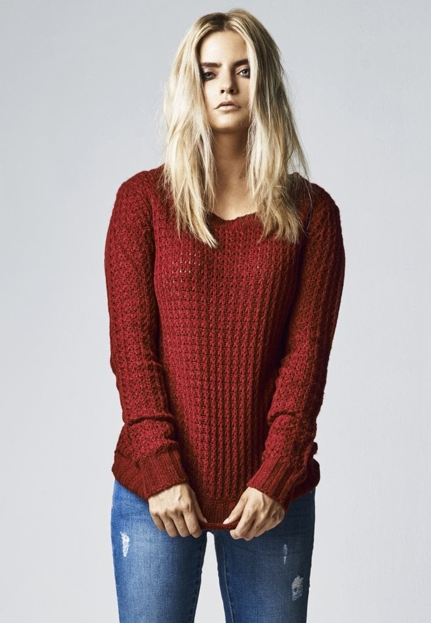A lovely sweatshirt with a wide collar and which is slightly longer in the model.